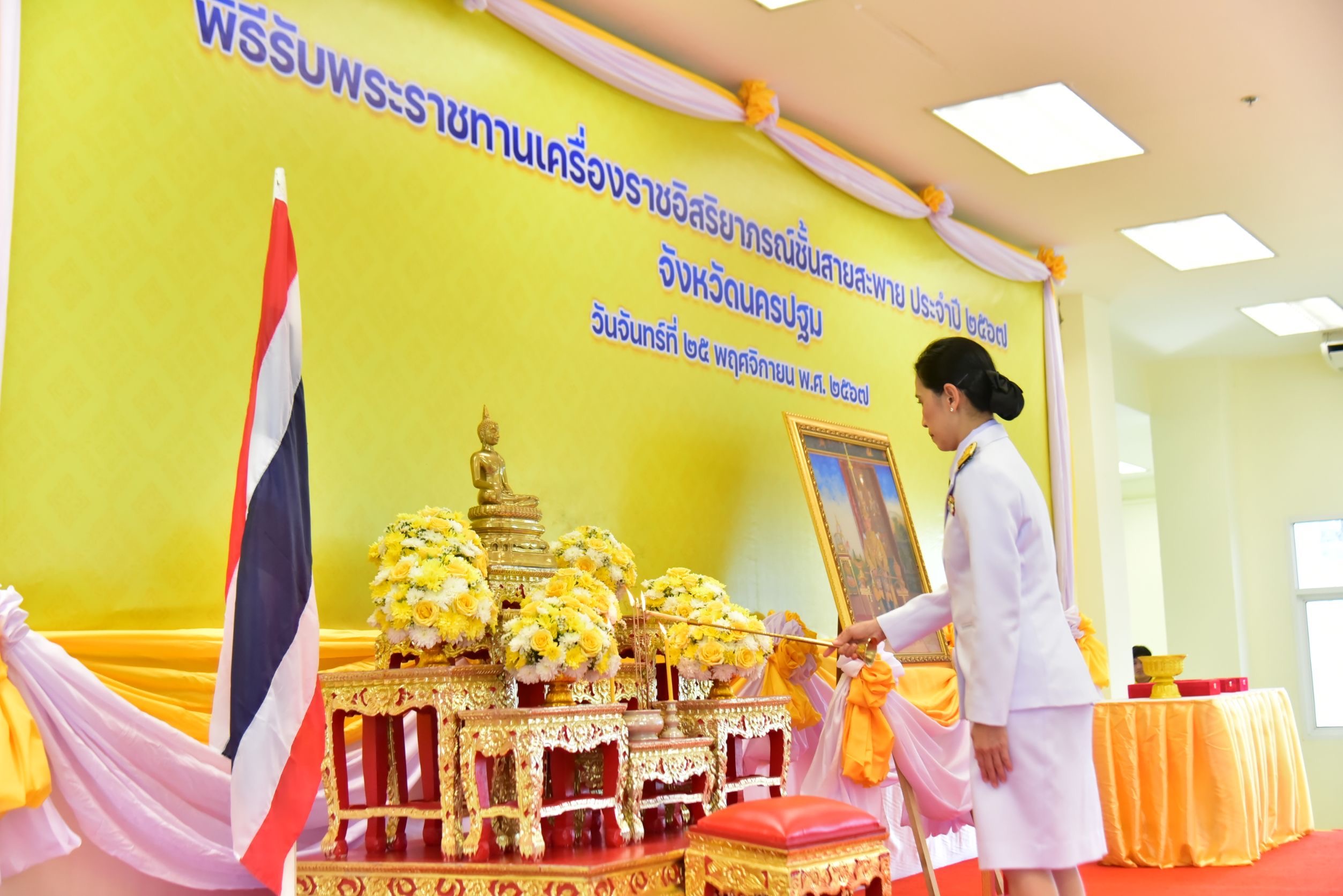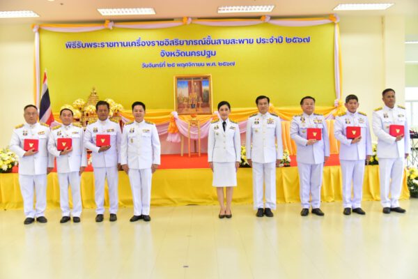 วันที่ 25 พฤศจิกายน 2567 ที่ห้องประชุมสนามจันทร์ ชั้น 5 ศาลากลางจังหวัดนครปฐม นางสาวอโรชา นันทมนตรี รองผู้ว่าราชการจังหวัดนครปฐม รักษาราชการแทนผู้ว่าราชการจังหวัดนครปฐม เป็นประธานพิธีรับพระราชทานเครื่องราชอิสริยาภรณ์ชั้นสายสะพาย ประจำปี 2567 เบื้องหน้าพระบรมฉายาลักษณ์ พระบาทสมเด็จพระเจ้าอยู่หัว แก่ผู้ที่ได้รับพระราชทานเครื่องราชอิสริยาภรณ์ชั้นประถมาภรณ์ช้างเผือก (ป.ช.) สังกัดกระทรวงมหาดไทย เฉพาะที่ปฏิบัติหน้าที่ในส่วนภูมิภาค