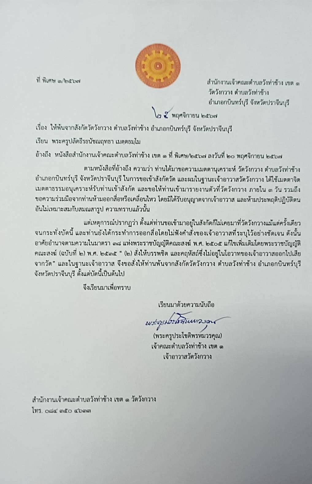 ทนายพจน์ กล่าวว่า สำหรับการเดินทางเข้ามายื่นหนังสือในวันนี้สืบเนื่องจาก เมื่อวันที่ 25 พฤศจิกายน 2567 ได้มีหนังสือ จากพระครูโชติพรหมวรคุณ เจ้าอาวาสวัดวังกวาง ตำบลท่าช้าง อำเภอกบินทร์บุรี จังหวัดปราจีนบุรี เรื่อง ให้พระครูปลัดธีระฯ หรือพระปีนเสา พ้นจากสังกัดวัดวังกวาง หลังจากมีการเข้าไปขอเข้าอยู่ในสังกัด ตั้งแต่วันที่ 20 พฤศจิกายน 2567และทางเจ้าอาวาสวัดวังกวาง ได้แจ้งให้เข้าไปรายงานตัวภายใน 3 วัน และขอความร่วมมือห้ามออกสื่อหรือเคลื่อนไหวโดยไม่ได้รับอนุญาตจากเจ้าอาวาสและประพฤติปฏิบัติตนอันไม่เหมาะสม แต่ปรากฏว่าพระปีนเสาไม่เคยเข้ามารายงานตัวแม้แต่ครั้งเดียวจนกระทั่งถึงเมื่อวานนี้ และท่านยังได้กระทำโดยไม่ฟังคำสั่งของเจ้าอาวาสที่ระบุเอาไว้จึงอาศัยความตามมาตรา 38 แห่งพระราชบัญญัติคณะ พุทธศักราช 2505 แก้ไขเพิ่มเติมโดยพระราชบัญญัติคณะสงฆ์ (ฉบับที่ 2) พ.ศ.2535 “(2) สั่งให้บรรพชิต และคฤหัสน์ ซึ่งไม่อยู่ในโอวาทของเจ้าอาวาสออกไปเสียจากวัด หมายความว่าพระปีนเสา ไม่มีสังกัดอยู่แล้วนับตั้งแต่เมื่อวันที่ 20 พฤศจิกายนที่ผ่านมา