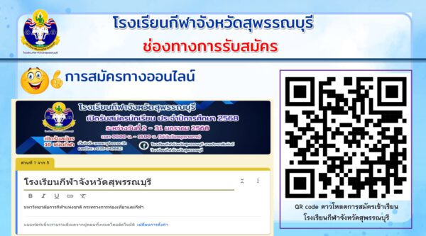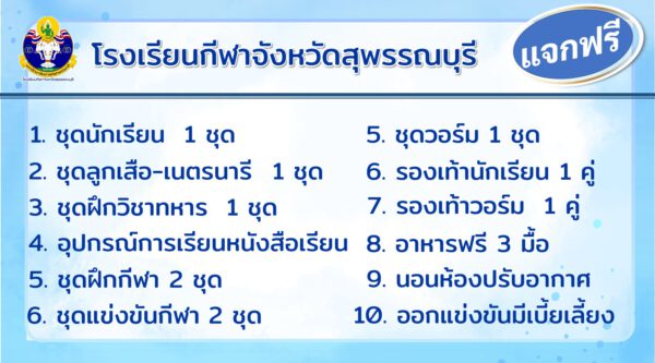 ทั้งนี้ ขอเชิญเยาวชนผู้สนใจในการกีฬาหรือมีความสามารถด้านกีฬาสมัครเรียนได้ตามวันเวลาและสถานที่ดังกล่าว สอบถามรายละเอียดเพิ่มเติมตามเอกสารดังแนบหรือทางเว็บไซต์ www.spss.ac.th. โรงเรียนกีฬาจังหวัดสุพรรณบุรี หรือเบอร์โทรศัพท์ 0 3554 5662
