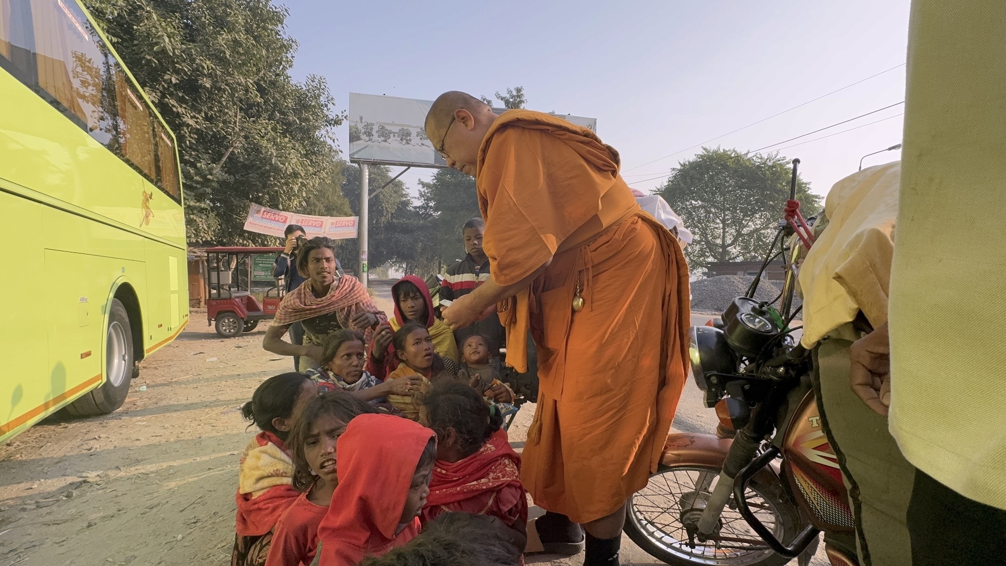 “นอกเหนือจากการได้แสวงบุญ ได้กราบนมัสการสังเวชนียสถานที่สำคัญ ในประเทศอินเดีย สิ่งหนึ่งที่ญาติโยมได้รับและเห็นมาตลอดเส้นทางนั่นคือการให้ทานกับผู้ยากไร้ที่จะขอเข้ามารับบริจาคจากกลุ่มคณะทัวร์ธรรม ซึ่งเดินทางมาจากหลายประเทศทั่วโลก เป็นหนึ่งในการแสดงออกในเรื่องของการละ วาง การให้ และมีเมตตาต่อผู้อื่น ซึ่งจะทำให้ผู้ร่วมเดินทางได้เห็นภาพจริง ได้เข้าใจวัฏจักรของโลก และเข้าใกล้กับพระธรรมคำสั่งสอนของพระพุทธองค์ ซึ่งนอกเหนือจากการได้ทำบุญแล้ว ยังมีการให้ทาน เป็นอีกหนึ่งในวิถีชีวิตที่คงอยู่ณปัจจุบัน อาตมาตระหนักให้เห็นทุกรูปแบบทั้งประวัติความเป็น เส้นทางความเป็นไป และปัจจุบันที่ทุกท่านได้ร่วมเดินทาง อันสืบเนื่องส่งให้ให้ถึงการตระหนักรู้ ตื่นรู้ และเข้าใจ ธรรมะ ซึ่งก็คือธรรมธรรมชาตินั่นเอง” หลวงพี่น้ำฝนกล่าวปิดท้าย