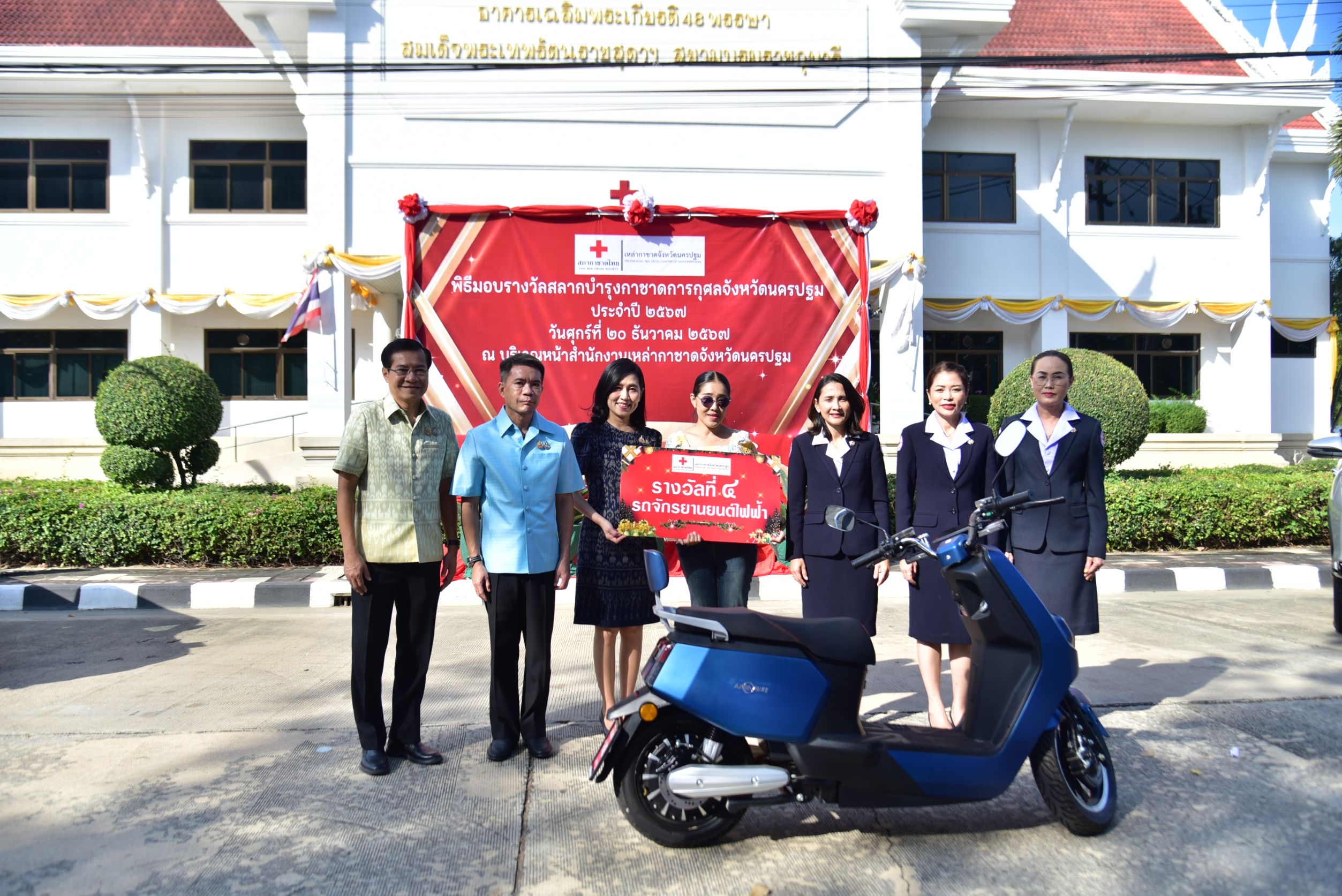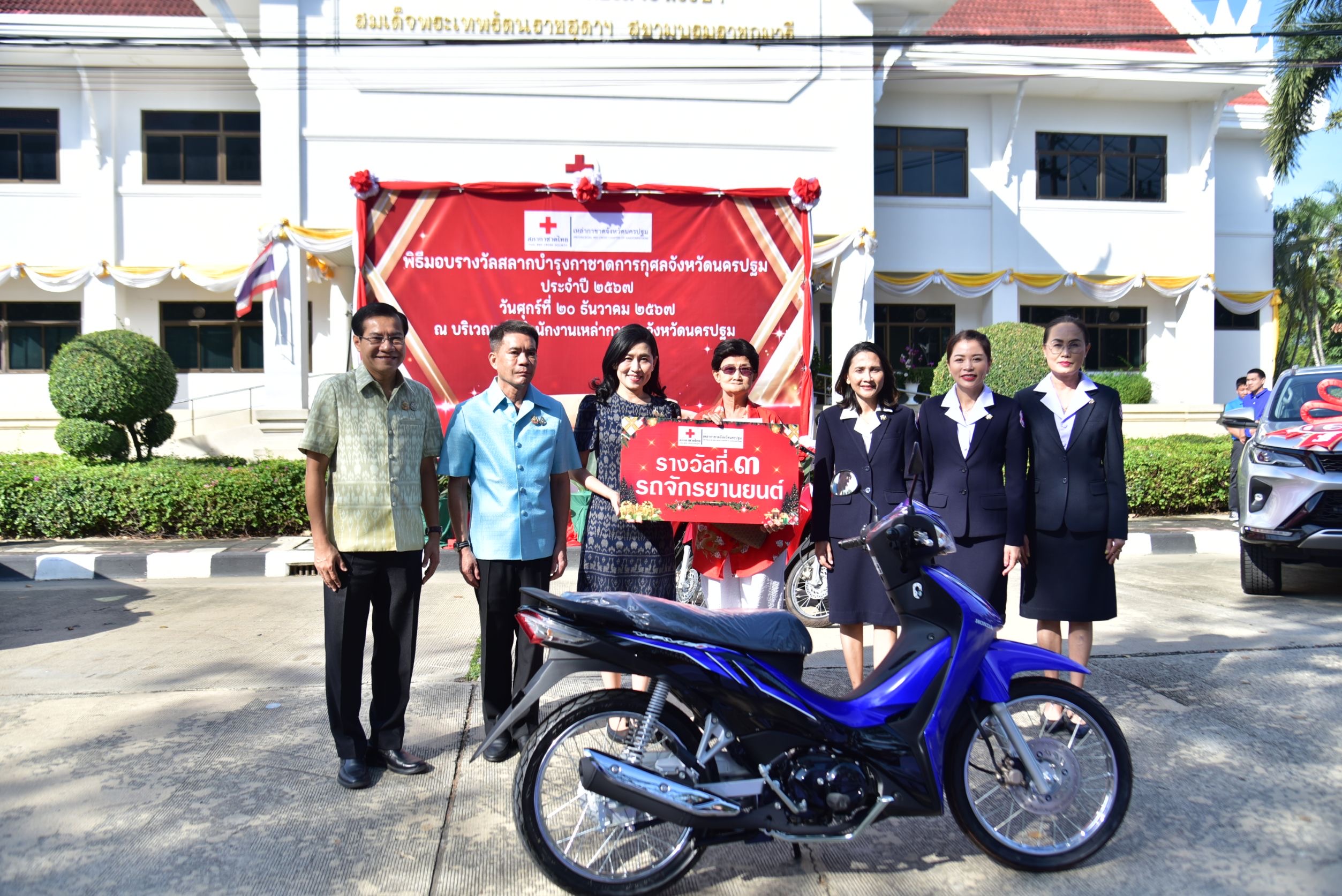 วันที่ 20 ธันวาคม พ.ศ. 2567 นางสาวอโรชา นันทมนตรี รองผู้ว่าราชการจังหวัด รักษาราชการแทน ผู้ว่าราชการจังหวัดนครปฐม รักษาการแทน นายกเหล่ากาชาดจังหวัดนครปฐม พร้อมด้วย รองผู้ว่าราชการจังหวัดนครปฐม รองนายกเหล่ากาชาดจังหวัดนครปฐม ปลัดจังหวัดนครปฐม หัวหน้าส่วนราชการ คณะกรรมการและสมาชิกเหล่ากาชาดจังหวัดนครปฐม ร่วมพิธีมอบรางวัล ให้กับผู้โชคดี ที่ถูกรางวัลสลากบำรุงกาชาดการกุศล ประจำปี 2567 ณ บริเวณหน้าสำนักงานเหล่ากาชาดจังหวัดนครปฐม