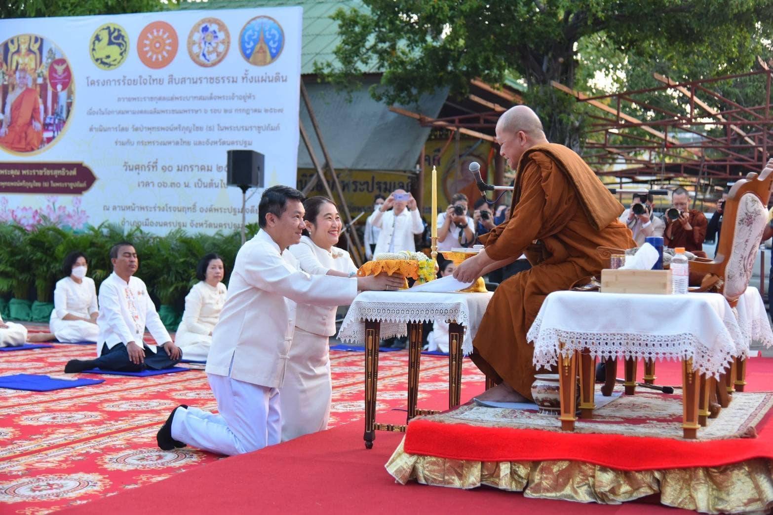 นายอรรษิษฐ์ สัมพันธรัตน์ ปลัดกระทรวงมหาดไทย ได้รับทราบดำริในพระเดชพระคุณพระราชวัชรสุทธิวงศ์ (เจ้าคุณอารยวังโส) จึงร่วมกันขับเคลื่อนโครงการ “ร้อยใจไทยสืบสานราชธรรม” ซึ่งเป็นโครงการที่ขยายผลมาจากโครงการ “ร้อยใจธรรม ร้อยอำเภอ สืบสานราชธรรม” สู่ระดับจังหวัด ซึ่งจัดขึ้นเพื่อน้อมถวายเป็นพระราชกุศลแด่พระบาทสมเด็จพระเจ้าอยู่หัว ด้วยการเผยแผ่ราชธรรมที่นักปกครองและประชาชนควรเรียนรู้และถือปฏิบัติ อันจะเป็นการปลูกฝัง เสริมสร้างอุดมการณ์ให้แก่นักปกครอง องค์กรเอกชน ประชาชนทั่วไป รวมถึงคณะกรรมการและสมาชิกของสมาคมแม่บ้านมหาดไทยได้มีหลักการและวิธีการตามแนวทางราชธรรม โดยกำหนดเป้าหมายโครงการฯ ในระยะที่ 1 จำนวน 15 จังหวัด ซึ่งจังหวัดนครปฐม เป็นหนึ่งในจังหวัดนำร่องที่ได้จัดกิจกรรมขึ้น ด้วยความมุ่งหมายในการร่วมทำความดีเฉลิมพระเกียรติ รวมทั้งเป็นการสร้างสรรค์จังหวัดนครปฐมให้เป็นเมืองแห่งความรุ่งโรจน์ เป็นอู่อารยธรรมสำคัญที่มีประวัติความเป็นมายาวนานและพระพุทธศาสนาสืบไป