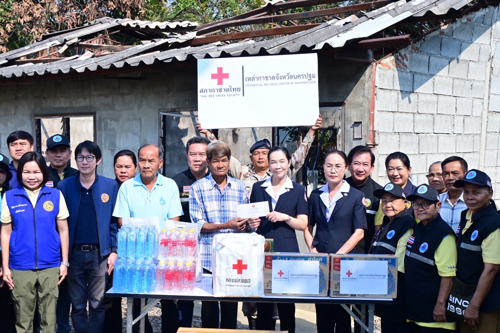 วันที่ 14 กุมภาพันธ์ พ.ศ. 2568 เวลา 10.30 น. นางสาวอโรชา นันทมนตรี ผู้ว่าราชการจังหวัดนครปฐม/นายกเหล่ากาชาดจังหวัดนครปฐม มอบหมายให้ นางวันวิสาข์ ดิลกพรเมธี รองนายกเหล่ากาชาดจังหวัดนครปฐม นางกัญจนา สร้อยอินทรากุล ผู้ช่วยนายกเหล่ากาชาดจังหวัดนครปฐม ผู้นำท้องที่ ผู้นำท้องถิ่น และหน่วยงานที่เกี่ยวข้อง ลงพื้นที่เยี่ยมผู้ประสบอัคคีภัย ให้แก่ นายอุเทน แสงสาด เพื่อบรรเทาความเดือดร้อนเบื้องต้น โดยเกิดเหตุเพลิงไหม้บ้านพักอาศัย ได้รับความเสียหายทั้งหลัง ไม่มีผู้ได้รับบาดเจ็บหรือเสียชีวิต เมื่อวันพฤหัสบดีที่ 30 มกราคม 2568 เวลาประมาณ 04.50 น. ที่ผ่านมา ณ บ้านเลขที่ 76/1 หมู่ 11 ตําบลห้วยขวาง อําเภอกำแพงแสน จังหวัดนครปฐม โดยเหล่ากาชาดจังหวัดนครปฐม มอบถุงยังชีพ นมดัชมิลล์ เสื้อ และของใช้ที่จำเป็น พร้อมเงินช่วยเหลือ จำนวน 10,000 บาท