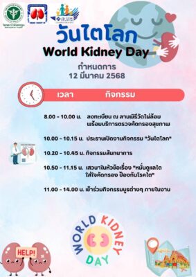 ผู้อำนวยการโรงพยาบาลนครปฐม เผยต่อว่า งานบริการไตเทียม โรงพยาบาลนครปฐมได้เล็งเห็นความสำคัญการหมั่นดูแลไต และการใส่ใจป้องกัน โรคไตและชะลอความเสื่อมของไต ตามนโยบายของ Service Plan ไตของกระทรวงสาธารณสุข จึงได้จัดโครงการ กิจกรรม วันไตโลก Kidney Day 2568 เพื่อให้ความรู้เกี่ยวกับการชะลอความเสื่อมของไต ตามคำขวัญ “ หมั่นดูแลไต ใส่ใจคัดกรอง ป้องกันโรคไต” ให้แก่ผู้ป่วยกลุ่มเสี่ยงและกลุ่มโรคไตเรื้อรังในเขตอำเภอเมือง จังหวัดนครปฐม โดยมีกิจกรรมประกอบด้วย นิทรรศการ การคัดกรองโรคไต การสาธิตอาหารลดเค็ม และอาหารสุขภาพ การออกกำลังกาย การใช้ยาในผู้ป่วยที่มีภาวะ ไตเสื่อม เพื่อป้องกันโรคไต โดยได้กำหนดให้มีการจัดกรรมขึ้นในวันที่ 12 มีนาคม 68 ตั้งแต่เวลา 08.00-14.00 น. ณ วิหารพระพุทธเมตตาประทานพร วัดไผ่ล้อม อ.เมือง จ.นครปฐม สำหรับการจัดกิจกรรมภายในงาน แบ่งเป็น 5 จุด ประกอบด้วย จุดที่ 1 การเจาะเลือดเพื่อตรวจค่าไตและตรวจปัสสาวะ ตั้งแต่เวลา 08.00-10.00 น. จุดที่ 2 การให้ความรู้โรคไต การป้องกันและชลอการเปิดโรคไต จุดที่ 3 การให้คำปรึกษาการใช้ยาและสมุนไพรอย่างปลอดภัย จุดที่ 4 การให้ความรู้กินอย่างไรไม่ให้เป็นโรคไต จุดที่ 5 ให้ความรู้การบำบัดทดแทนไต พร้อมแจกของที่ระลึกในงาน ซึ่งผู้ที่สนใจสามารถใช้บัตรประชาชนเพียงมาแสดงตัวภายในงาน