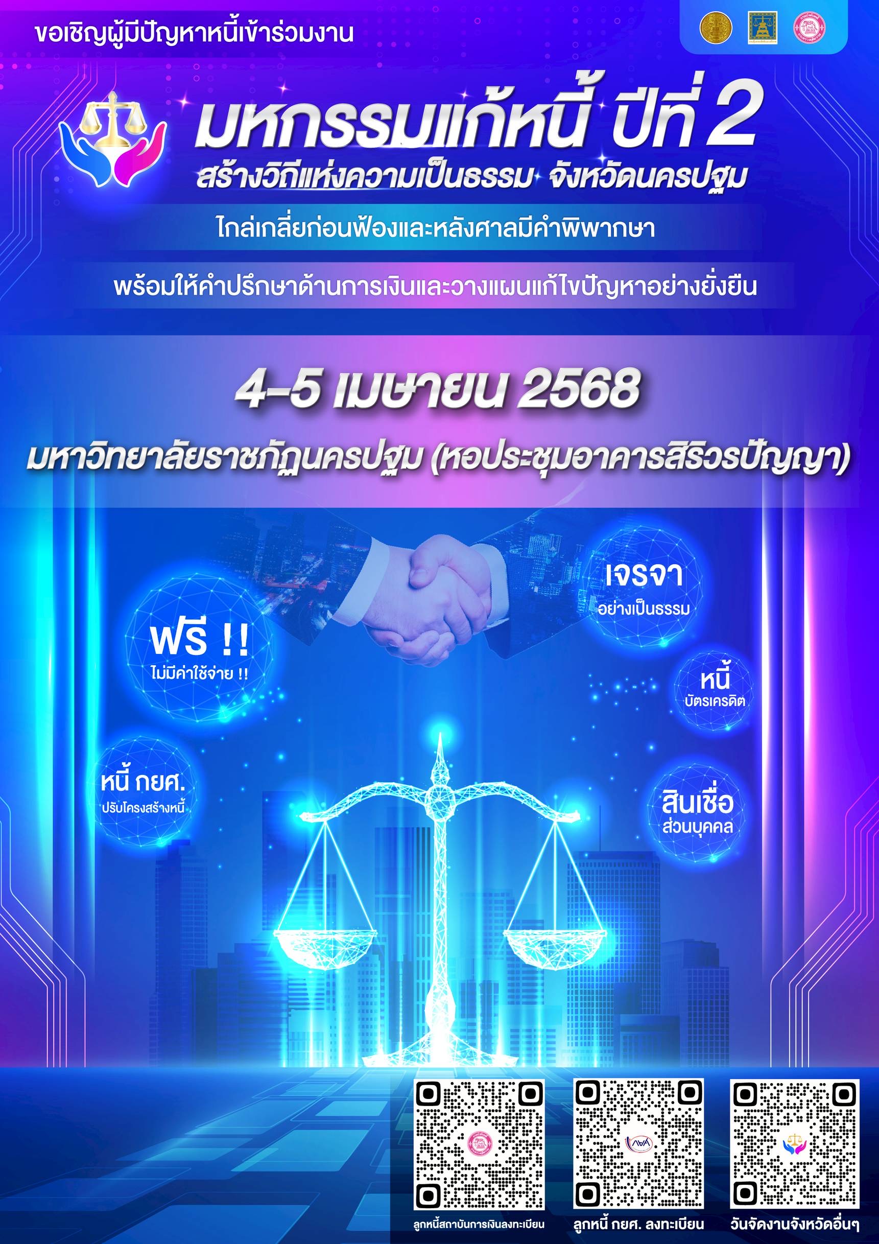 กระทรวงยุติธรรม โดยกรมคุ้มครองสิทธิและเสรีภาพร่วมกับสำนักงานยุติธรรมจังหวัดนครปฐม จัดงาน”มหกรรมแก้หนี้ สร้างวิถีแห่งความเป็นธรรม ปีที่ 2″ จังหวัดนครปฐม เพื่อช่วยเหลือประชาชน ลดภาระหนี้สิน ทั้งหนี้บัตรเครดิต หนี้กยศ. หนี้เช่าซื้อรถยนต์และรถจักรยานยนต์ หนี้สินข้าราชการ หนี้สินภาคเกษตรกรรม และสินเชื่อส่วนบุคคลที่ผิดนัดชำระหนี้เข้าเกณฑ์จะถูกฟ้องดำเนินคดี หรือไม่มีกำลังผ่อนชำระตามสัญญา ได้เข้าสู่กระบวนการไกล่เกลี่ยก่อนและหลังฟ้องคดี โดยไม่เสียค่าใช้จ่าย
