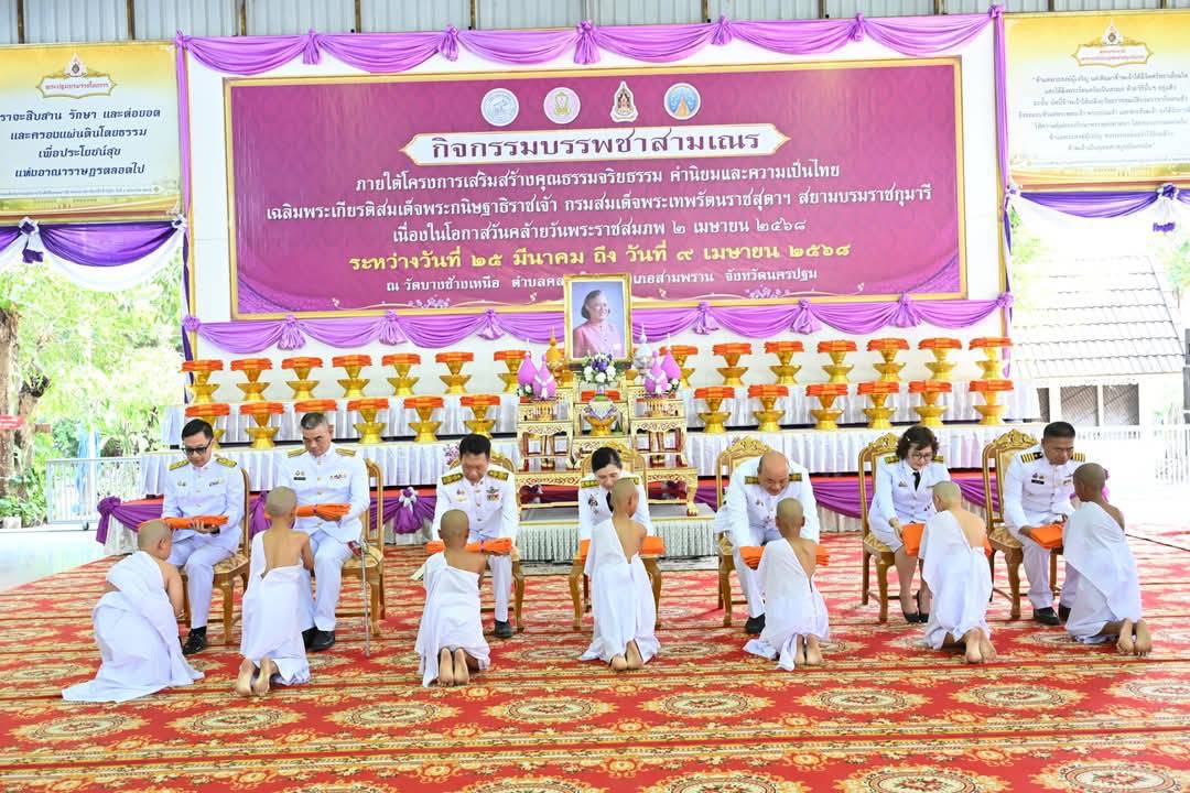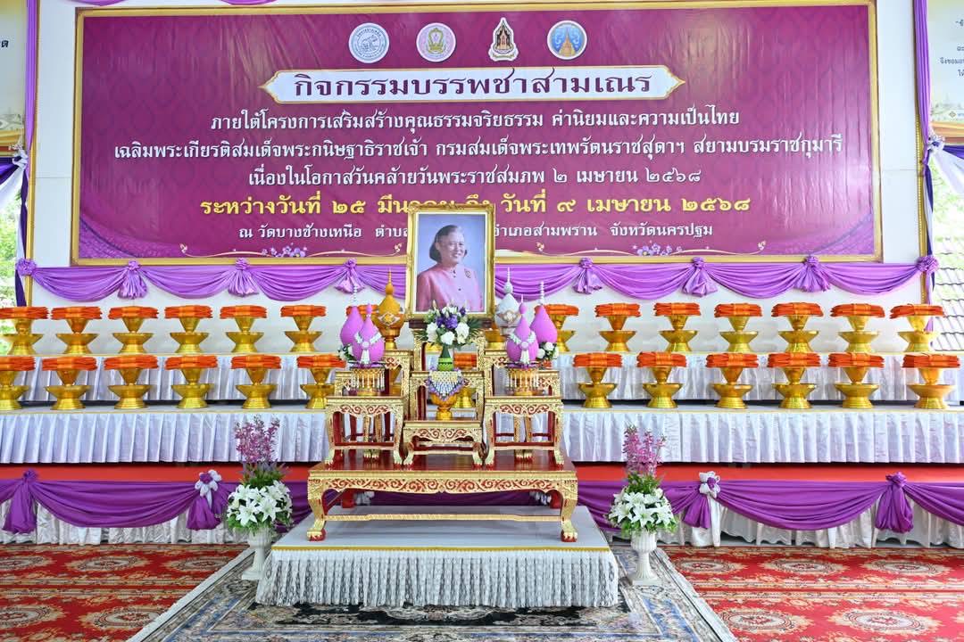 เมื่อวันที่ 26 มีนาคม 2568 เวลา 9.30 น. ที่ศาลาอเนกประสงค์ วัดบางช้างเหนือ ตำบลคลองใหม่อำเภอสามพราน จังหวัดนครปฐม พระราชวชิรสุตาภรณ์ เจ้าคณะจังหวัดนครปฐม เจ้าอาวาสวัดบางช้างเหนือ ประธานสงฆ์จัดพิธีมอบผ้าไตรและพิธีบรรพชาสามเณร ภายใต้โครงการเสริมสร้างคุณธรรมจริยธรรม ค่านิยมและความเป็นไทย เฉลิมพระเกียรติ สมเด็จพระกนิษฐาธิราชเจ้า กรมสมเด็จพระเทพรัตนราชสุดาฯ สยามบรมราชกุมารี เนื่องในโอกาสวันคล้ายวันพระราชสมภพ 2 เมษายน 2568 โดยมีนางสาวอโรชา นันทมนตรี ผู้ว่าราชการจังหวัดนครปฐม เป็นประธานพิธีฝ่ายฆราวาส นางฐิติรัตน์ เรืองสังข์ วัฒนธรรมจังหวัดนครปฐม กล่าวรายงานต่อประธานในพิธีฯ ว่าที่ร้อยโทอรรถชล ทรัพย์ทวี นายอำเภอสามพราน พร้อมด้วยหัวหน้าส่วนราชการ ผู้ปกครองผู้เข้ารับการบรรพชาอุปสมบทสามเณร พุทธศาสนิกชน เข้าร่วมพิธีฯ