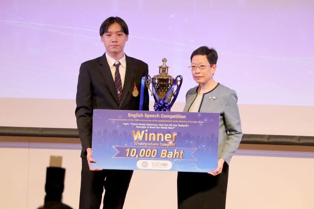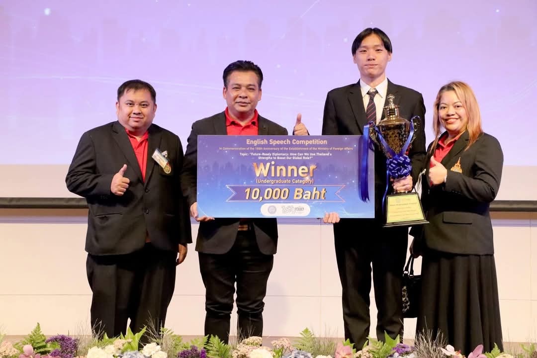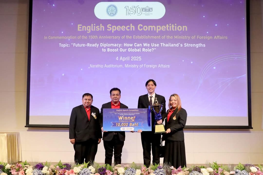 มทร.รัตนโกสินทร์ ขอแสดงความยินดีกับ นายชัยพิชิต บัวโอภาส นักศึกษาชั้นปีที่ 3 คณะศิลปศาสตร์ ที่สร้างชื่อเสียงให้กับมหาวิทยาลัย ด้วยการคว้ารางวัลชนะเลิศ ในการแข่งขัน English Speech Competition in Commemoration of the 150th Anniversary of the Establishment of the Ministry of Foreign Affairs ภายใต้หัวข้อ “Future-Ready Diplomacy: How Can We Use Thailand’s Strengths to Boost our Global Role?” ซึ่งนายชัยพิชิต บัวโอภาส สามารถถ่ายทอดแนวคิดอันโดดเด่นและวิสัยทัศน์กว้างไกล และแสดงศักยภาพด้านการสื่อสารภาษาอังกฤษได้อย่างยอดเยี่ยม จนสามารถคว้าชัยชนะในการแข่งขันครั้งนี้ได้สำเร็จ การแข่งขันจัดขึ้นในวันศุกร์ที่ 4 เมษายน 2568 ณ ห้องประชุมนราธิป กระทรวงการต่างประเทศ นับเป็นอีกก้าวสำคัญของนักศึกษาไทยที่ก้าวสู่เวทีระดับนานาชาติด้วยศักยภาพทางภาษาและการสื่อสารที่ยอดเยี่ยม มทร.รัตนโกสินทร์ ขอแสดงความยินดีและเป็นกำลังใจให้ นายชัยพิชิต บัวโอภาส เดินหน้าสร้างความภาคภูมิใจให้แก่ประเทศไทยต่อไป