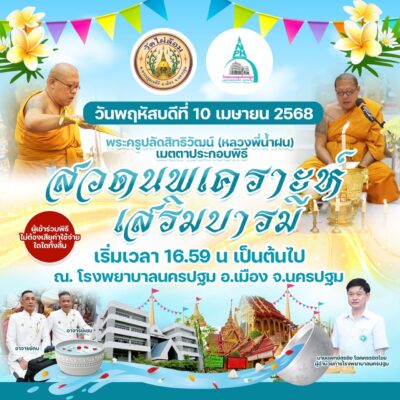 โดยพิธีจะจัดขึ้นในวันพฤหัสบดีที่ 10 เมษายน 68 ณ โรงพยาบาลนครปฐม อำเภอเมือง จังหวัดนครปฐม เริ่มในเวลา 16.59 น. เป็นต้นไป โดยผู้ที่เข้าร่วมในพิธีไม่มีการเสียค่าใช้จ่ายใดใดทั้งสิ้น สอบถามได้ที่ วัดไผ่ล้อม พระอารามหลวง โทร. 085-415-6414