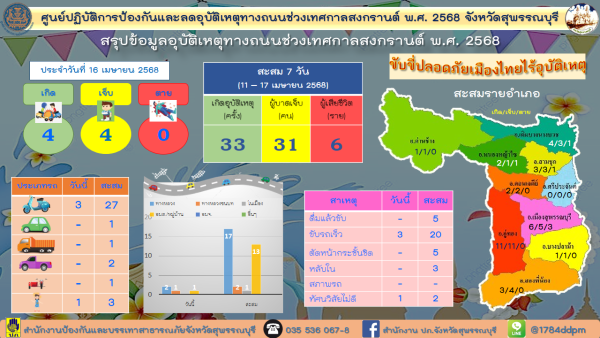 ด้าน นางสาวสุรีย์พร นามเมือง หัวหน้ายุทธศาสตร์และการจัดการ ปฏิบัติราชการแทนหัวหน้าสำนักงานป้องกันและบรรเทาสาธารณภัยจังหวัดสุพรรณบุรี กล่าวในฐานะเลขาศูนย์ฯว่า ข้อมูลอุบัติเหตุทางถนนช่วงเทศกาลสงกรานต์ 2568 ของวันที่ 16 เมษายน 2568 มีอุบัติเหตุ 4 จำนวน ครั้ง มีผู้บาดเจ็บ จำนวน 4 คน ชาย 3 คน หญิง 1 คน ไม่มีผู้เสียชีวิต /สะสม ระหว่างวันที่ 11-16 เมษายน 2568 มีอุบัติเหตุ 33 จำนวนครั้ง บาดเจ็บ จำนวน 31 คน ชาย 23 คน หญิง 8 คน เสียชีวิต 6 ราย ชาย 5 ราย หญิง 1 ราย