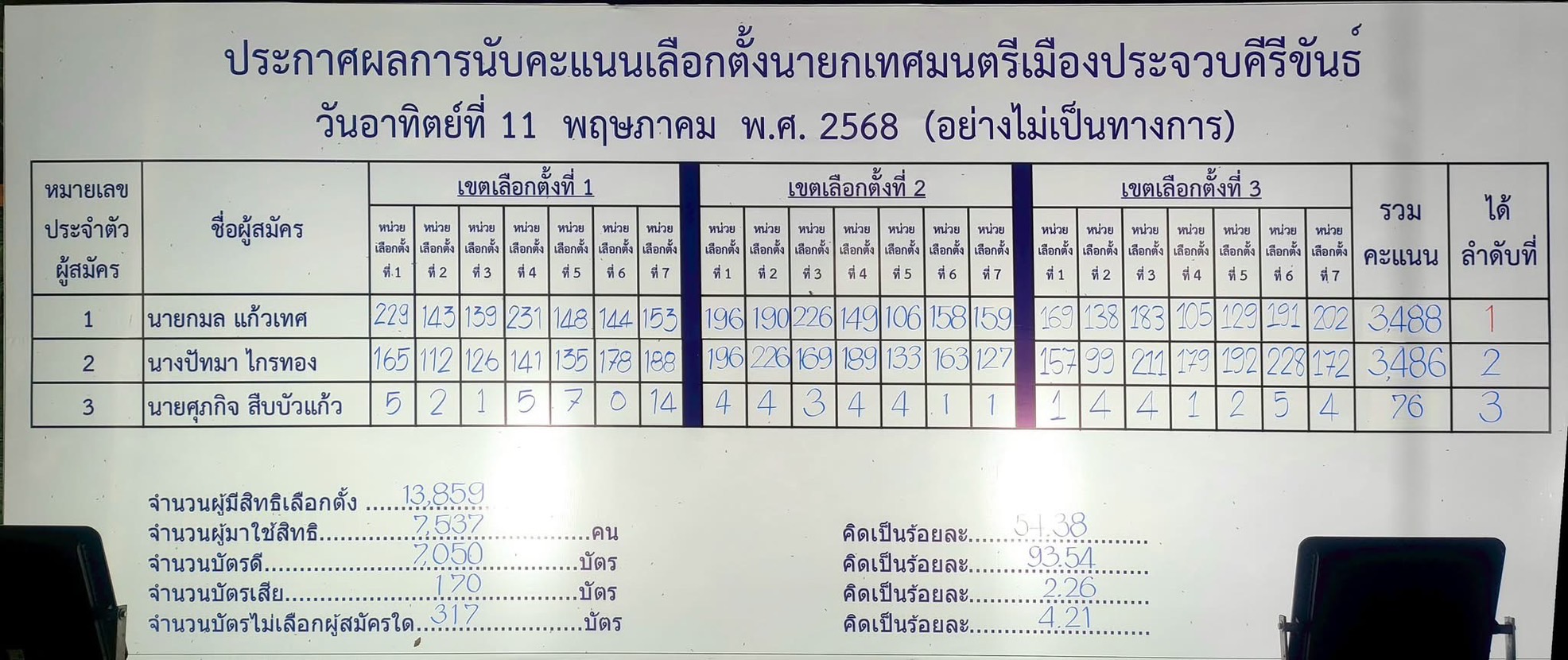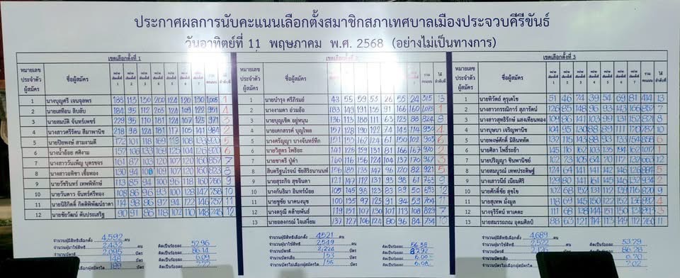 วันที่ 12 พ.ค.2568 ผู้สื่อข่าวรายงานว่า ผลการเลือกตั้งนายกเทศมนตรี และสมาชิกสภาเทศบาล(สท.)เมืองประจวบคีรีขันธ์ ซึ่งมีการลงคะแนนเลือกตั้งไปเมื่อวันที่ 11 พ.ค.68 ที่ผ่านมา ทั้งนี้ผลคะแนนอย่างไม่เป็นทางการ ของนายกเทศมนตรีฯ และ สท.ทั้ง 3 เขต มีดังนี้