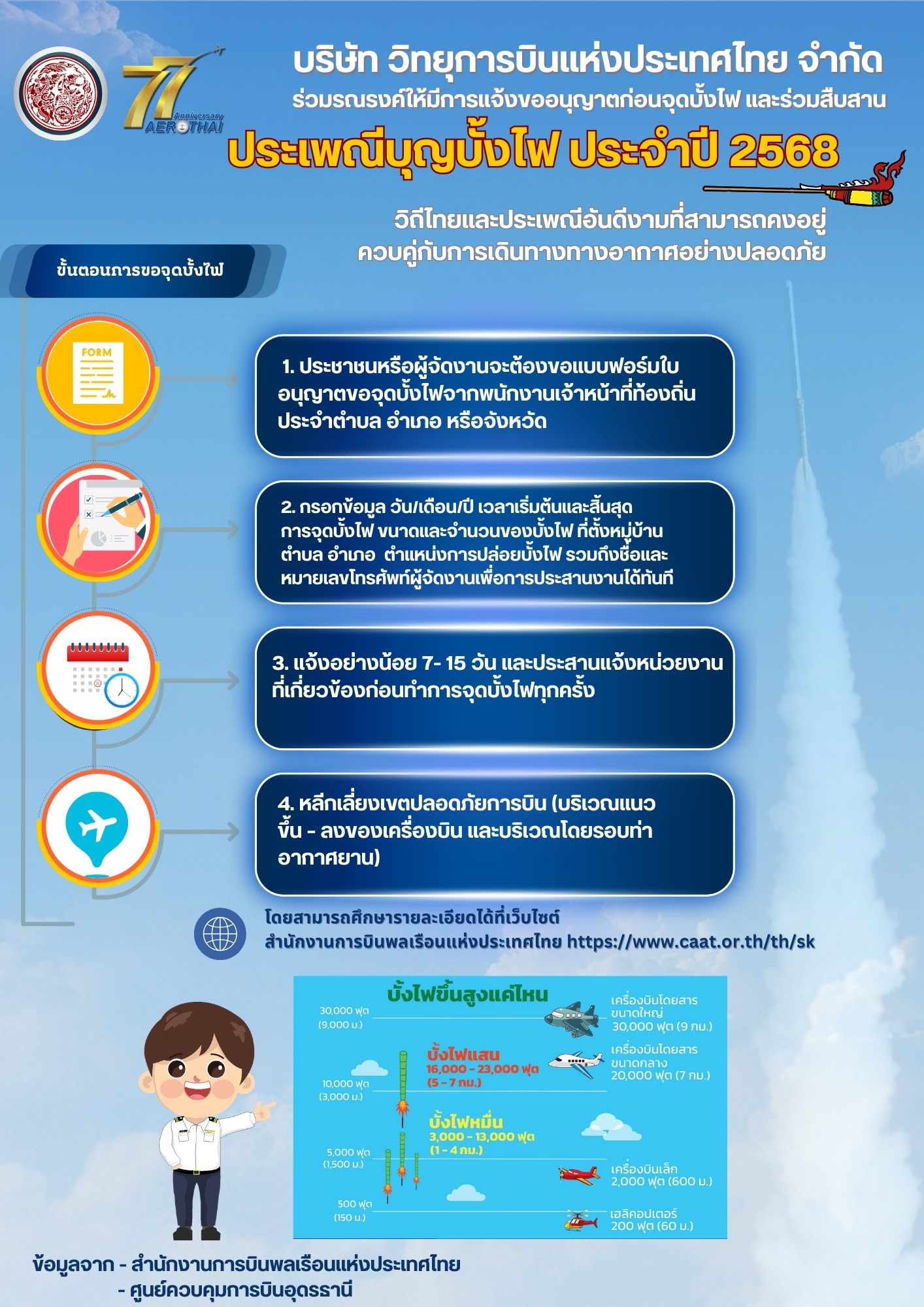 นางมนพร เจริญศรี รัฐมนตรีช่วยว่าการกระทรวงคมนาคม เปิดเผยว่า ช่วงเดือนพฤษภาคม – มิถุนายน 2568 เป็นช่วงเทศกาลประเพณีบุญบั้งไฟ โดยพื้นที่ภาคอีสานกำหนดจัดกิจกรรมอย่างกว้างขวางครอบคลุมพื้นที่หลายจังหวัด งานบุญบั้งไฟเป็นการส่งเสริมภูมิปัญญาท้องถิ่น และอนุรักษ์ประเพณีอันดีงาม รวมถึงช่วยกระตุ้นเศรษฐกิจและการท่องเที่ยวของคนในท้องถิ่น ทั้งนี้ ได้สั่งการให้ บริษัท วิทยุการบินแห่งประเทศไทย จำกัด (บวท.) ร่วมสื่อสารรณรงค์เรื่องการ “จุดบั้งไฟอย่างไรให้ปลอดภัยต่อการบิน” โดยประสานไปยังจังหวัด เพื่อให้ข้อมูลแก่หน่วยงานภาครัฐ ภาคเอกชน และประชาชน รณรงค์ให้มีการแจ้งขออนุญาตก่อนจุดบั้งไฟ ตามแนวทางการปฏิบัติของสำนักงานการบินพลเรือนแห่งประเทศไทย (กพท.) หรือตามประกาศที่จังหวัดกำหนด โดยให้ประสานหน่วยงานปกครองในพื้นที่ล่วงหน้าก่อนการจัดงาน เพื่อท่าอากาศยานจะได้นำข้อมูลมาจัดทำเป็นข่าวประกาศนักบิน (Notice To Airmen : NOTAM) สำหรับใช้เป็นข้อมูลประกอบการตัดสินใจในการจัดทำแผนการบิน และการทำการบินของนักบิน รวมถึงเป็นข้อมูลให้กับเจ้าหน้าที่ควบคุมจราจรทางอากาศ ในการอำนวยความสะดวกแก่สายการบินในแต่ละเที่ยวบิน เพื่อให้เกิดความปลอดภัยในทุกเที่ยวบิน