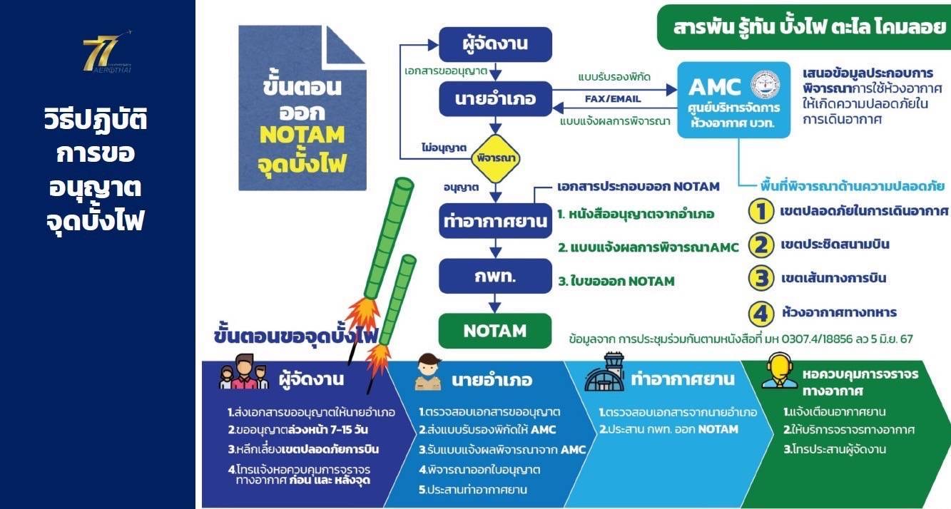 นายสุรชัย หนูพรหม รองกรรมการผู้อำนวยการใหญ่ รักษาการ กรรมการผู้อำนวยการใหญ่ บริษัท วิทยุการบินแห่งประเทศไทย จำกัด (บวท.) เปิดเผยว่า จากสถิติการออกประกาศ NOTAM การจุดบั้งไฟ ในปี 2567 ที่ผ่านมา มีการแจ้งจุดบั้งไฟ จำนวน 1,747 ครั้ง โดยจังหวัดที่แจ้งการจุดบั้งไฟ สูงที่สุดได้แก่ อุดรธานี หนองบัวลำพู ขอนแก่น ยโสธร ร้อยเอ็ด และอุบลราชธานี ตามลำดับ ซึ่งข้อมูลการแจ้งขออนุญาตก่อนจุด เป็นประโยชน์ต่อการบริหารจัดการด้านการบินอย่างมาก