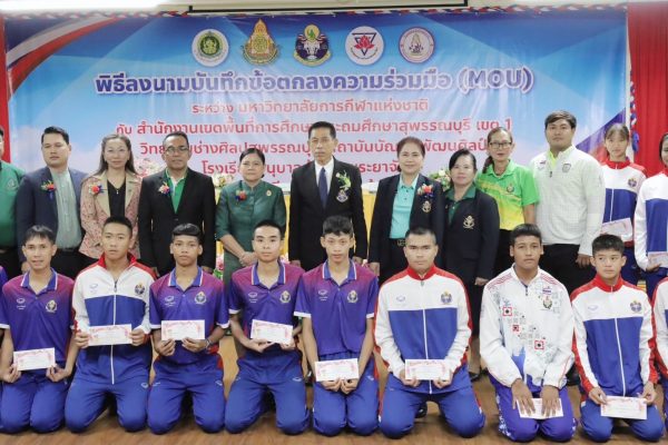 ในการนี้นางสมจิต บุญคงเสน ผู้อำนวยการโรงเรียนกีฬาจังหวัดสุพรรณบุรีได้กล่าวขอบคุณอธิการบดีมหาวิทยาลัยการกีฬาแห่งชาติและกล่าวถึงความร่วมมือ ของทั้ง 4 หน่วยงาน สำนักงานพื้นที่การศึกษาประถมศึกษาสุพรรณบุรีเขต1 นำโดย ดร.สุภาวดี มิสุนา ได้ให้ความร่วมมือสนับสนุนด้านการจัดการศึกษา แลกเปลี่ยนบุคลากรกับโรงเรียนกีฬาจังหวัดสุพรรณบุรีมาโดยตลอด สำหรับเขตพื้นที่การศึกษาขอความร่วมมือในการจัดการเรียนการสอนแบบพหุปัญญา /วิทยาลัยช่างศิลปสุพรรณบุรีสถาบันบัณฑิตพัฒนศิลป์ โดยผู้ช่วยศาสตราจารย์โกเมศ คันธิก ผู้อำนวยการวิทยาลัยช่างศิลปสุพรรณบุรีสถาบันบัณฑิตพัฒนศิลป์ ได้ร่วมมือด้านการจัดการศึกษาโดยนำนักศึกษาจากวิทยาลัยช่างศิลปสุพรรณบุรีสถาบันบัณฑิตพัฒนศิลป์ เข้าฝึกประสบการณ์วิชาชีพกับนักเรียนโรงเรียนกีฬาจังหวัดสุพรรณบุรี /โรงเรียนอนุบาลบ้านท่าพระยาจักร โดย ผอ.ปริศนา ปัญสิงห์ ผู้อำนวยการโรงเรียนอนุบาลบ้านท่าพระยาจักร และ โรงเรียนวัดป่าพระเจ้า โดย ผอ.ดร.กฤษดา บัวศรี ผู้อำนวยการโรงเรียนวัดป่าพระเจ้า ร่วมมือด้านการส่งนักกีฬาเข้ามาศึกษาต่อในโรงเรียนกีฬาจังหวัดสุพรรณบุรี และแลกเปลี่ยนเรียนรู้ด้านทักษะการกีฬา