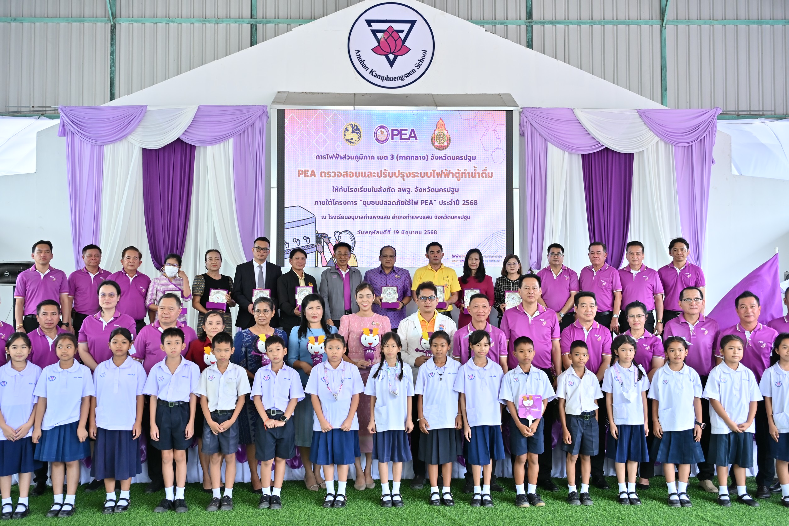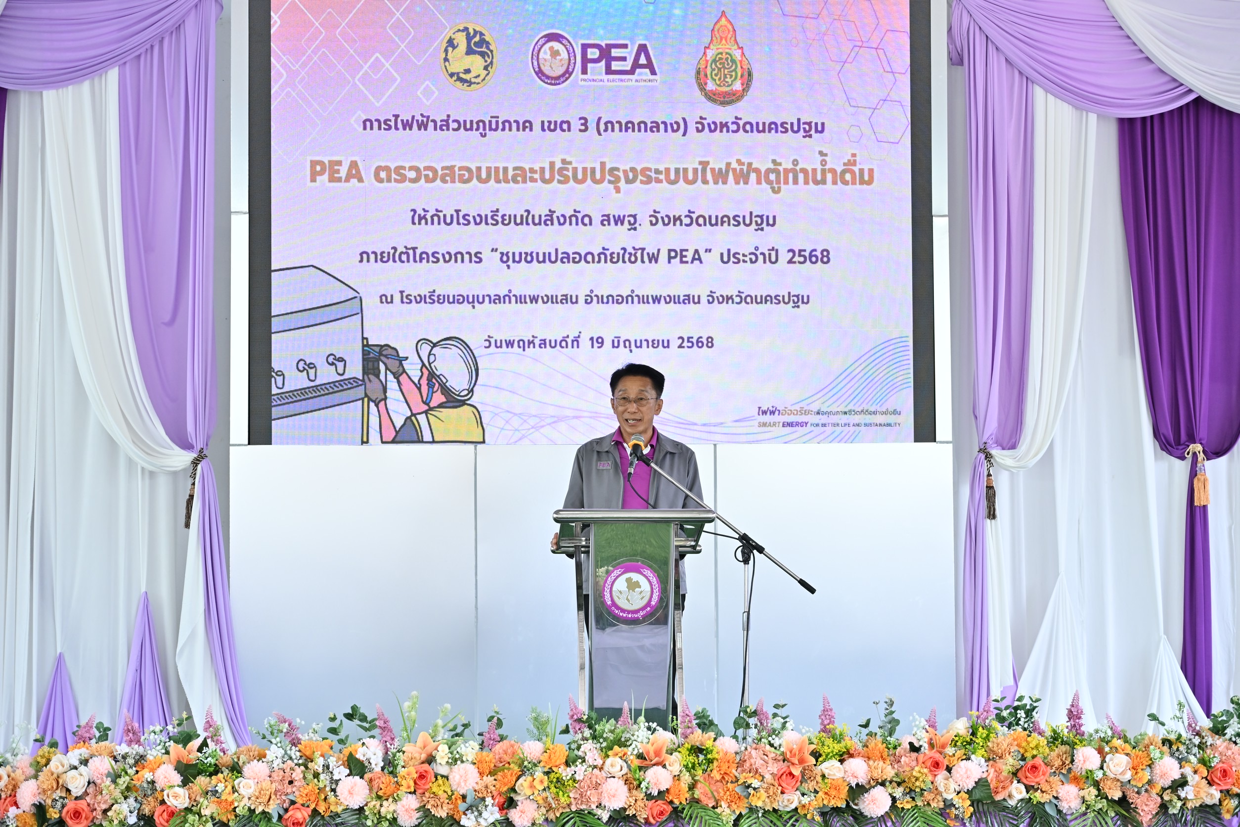 วันที่ 19 มิถุนายน 2568 นายธนะ โชคพระสมบัติ ผู้ช่วยผู้ว่าการการไฟฟ้าส่วนภูมิภาค เป็นประธานในพิธีส่งมอบกิจกรรม ตรวจสอบและปรับปรุงระบบไฟฟ้า ตู้ทำน้ำดื่ม ให้กับโรงเรียนในสังกัด สพฐ.จังหวัดนครปฐม ภายใต้โครงการชุมชนปลอดภัยใช้ไฟ PEA ประจำปี 2568 ณ โรงเรียนอนุบาลกำแพงแสน อำเภอกำแพงแสน จังหวัดนครปฐม โดยมี นายรณภพ เวียงสิมมา รองผู้ว่าราชการจังหวัดนครปฐม ดร.พาณุวัฒณ์ สะสมทรัพย์ สมาชิกสภาผู้แทนราษฎร เขต3 นครปฐม นางบุญรัตน์ กองทอง ประชาสัมพันธ์จังหวัด นายพิเชฐ อรุณมาศ ผู้จัดการการไฟฟ้าส่วนภูมิภาคจังหวัดนครปฐม ผู้บริหารสถานศึกษา และนักเรียนร่วมพิธี