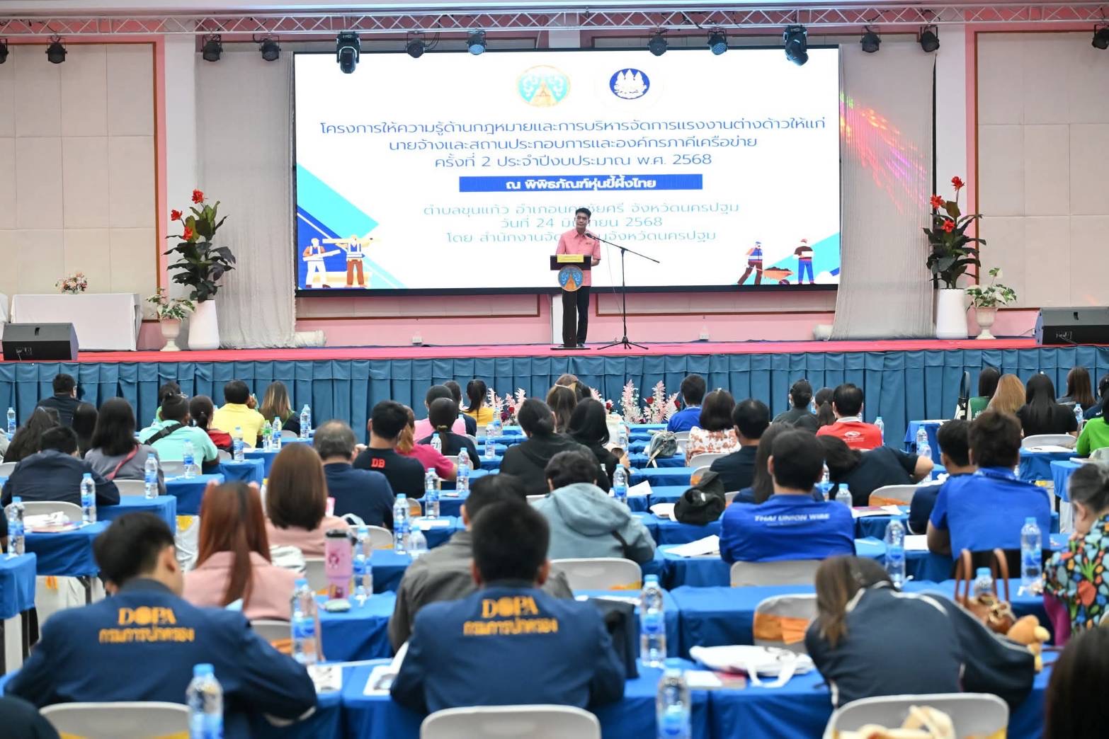 เมื่อวันที่ 24 มิถุนายน 2568 ที่ห้องประชุมพิพิธภัณฑ์หุ่นขี้ผึ้งไทย ตำบลขุนแก้ว อำเภอนครชัยศรี จังหวัดนครปฐม นายยงยุทธ สวนทอง รองผู้ว่าราชการจังหวัดนครปฐม เป็นประธานเปิดโครงการให้ความรู้ด้านกฎหมายและการบริหารจัดการแรงงานต่างด้าวให้แก่นายจ้าง สถานประกอบการ และองค์กรภาคีเครือข่าย ครั้งที่ 2 ประจำปีงบประมาณ 2568 โดยนางเจนจิรา เดชะรัฐ จัดหางานจังหวัดนครปฐม กล่าวว่า สืบเนื่องจากคณะรัฐมนตรีเมื่อวันที่ 24 กันยายน 2567 และเมื่อวันที่ 4 กุมภาพันธ์ 2568 กำหนดแนวทางการบริหารจัดการแรงงานต่างด้าวสัญชาติกัมพูชา ลาว เมียนมา และเวียดนาม ทั้งกลุ่มแรงงานต่างด้าวที่ได้รับอนุญาตทำงานเดิมถึงวันที่ 13 กุมภาพันธ์ 2568 และกลุ่มแรงงานต่างด้าวที่มีสถานะไม่ถูกต้องตามกฎหมาย ปัจจุบันบางส่วนดำเนินการเสร็จสิ้นแล้ว ประกอบกับกรมการจัดหางานแจ้งแนวทางการเปลี่ยนนายจ้างและการเปลี่ยนประเภทของแรงงานต่างด้าวที่ได้รับอนุญาตทำงาน ซึ่งจังหวัดนครปฐม มีนายจ้าง สถานประกอบการที่จ้างคนต่างด้าว จำนวน 26,278 ราย มีคนต่างด้าวได้รับอนุญาตให้ทำงาน จำนวน 126,246 คน ประกอบด้วยคนต่างด้าวเข้าเมืองถูกกฎหมายตามมาตรา 59 บุคคลซึ่งไม่มีสถานะทางทะเบียนตามมาตรา 63/1 (4) และมากที่สุดเป็นคนต่างด้าว 4 สัญชาติ คือ กัมพูชา ลาว เมียนมา และเวียดนาม ซึ่งยังมีนายจ้าง สถานประกอบการ ที่มีการจ้างแรงงานต่างด้าวตามมติคณะรัฐมนตรีเมื่อวันที่ 24 กันยายน 2567 สัญชาติกัมพูชาและสัญชาติเมียนมา ที่ได้รับอนุญาตทำงานเดิมถึงวันที่ 13 กุมภาพันธ์ 2568 ยังอยู่ระหว่างดำเนินการไม่แล้วเสร็จอีกจำนวนไม่น้อย