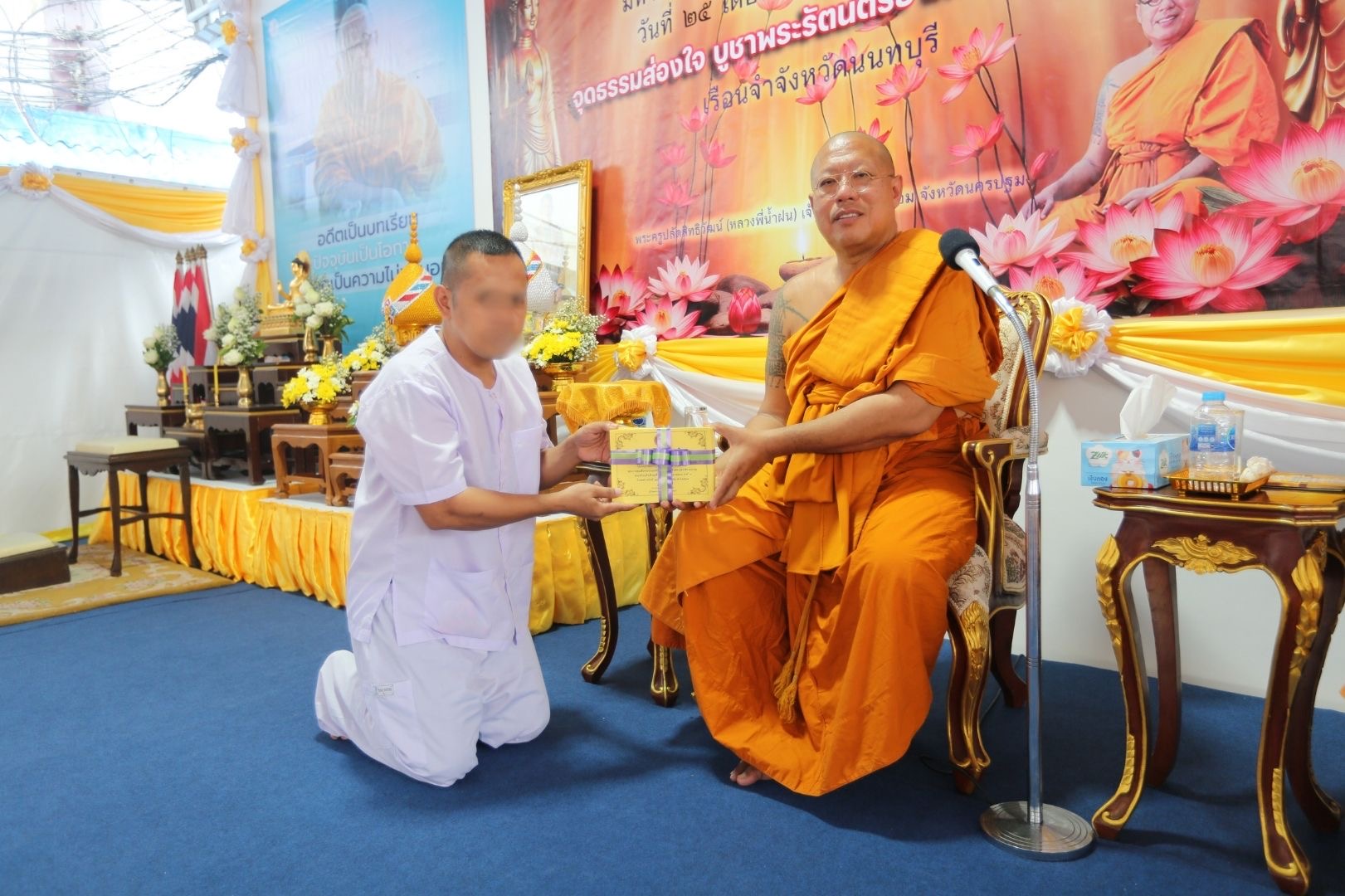 วันเดียวกันนางกนกวรรณ จิ๋วเชื้อพันธุ์ ผู้บัญชาการเรือนจำจังหวัดนนทบุรี ได้นิมนต์หลวงพี่น้ำฝน ได้ทำการปะพรมเจิมป้ายอาคารและทำพิธีเปิด “อาคารหลวงพี่น้ำฝน” ซึ่งได้มีการสนับสนุนในการจัดสร้างเพื่อให้เป็นประโยชน์ในการปฏิบัติหน้าที่ภายในเรือนจำจังหวัดนนทบุรี ซึ่งคณะสงฆ์วัดไผ่ล้อมพระอารามหลวง จังหวัดนครปฐม ยังคงมีตั้งแนวทางในการนำพระธรรมหลักคำสั่งสอนตามรอยพระพุทธองค์สำหรับจรรโลงใจให้กับญาติโยมและผู้คนร่วมสังคมให้เกิดความผาสุกในการอยู่ร่วมกัน ภายใต้ 3 สถาบันหลักประกอบด้วย ชาติ ศาสนา พระมหากษัตริย์ เป็นที่ตั้งเพื่อให้ประชาชนชาวไทยมีความสุขสงบสืบไป