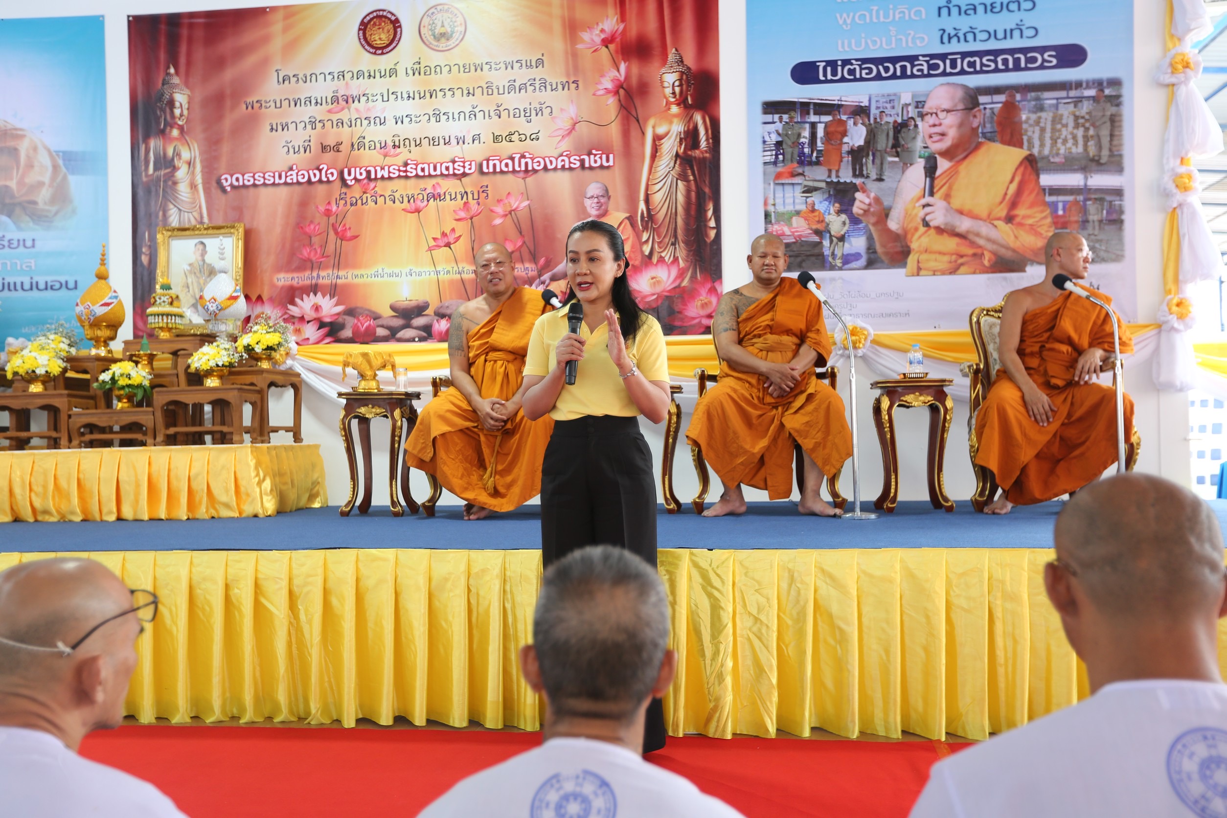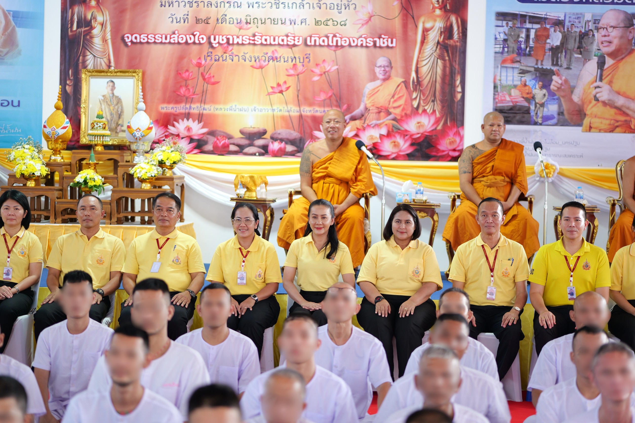 นางกนกวรรณ จิ๋วเชื้อพันธุ์ ผู้บัญชาการเรือนจำจังหวัดนนทบุรี ได้นำคณะผู้บริหาร เจ้าหน้าที่และผู้ต้องขังจำนวน 200 คนเข้าร่วมกิจกรรม “สวดมนต์ถวายพระพร” เพื่อแสดงความจงรักภักดีและเฉลิมพระเกียรติ พระบาทสมเด็จพระปรเมนทรรามาธิบดีศรีสินทรมหาวชิราลงกรณ พระวชิรเกล้าเจ้าอยู่หัว โดยเป็นการจัดกิจกรรมเพื่อนำร่องให้กับคณะผู้บริหาร เจ้าหน้าที่ ผู้ต้องขัง ได้นำการสวดมนต์มาเป็นทำกิจกรรมร่วมกันเพื่อถวายความจงรักภักดีแล้วแสดงออกในการน้อมสำนึกในพระมหากรุณาธิคุณที่ทรงมีต่อพสกนิกรชาวไทยเสมอมา ซึ่งภายในการจัดกิจกรรม นอกเหนือจากการสวดมนต์แล้ว หลวงพี่น้ำฝน ยังได้มีการบรรยายธรรมที่เข้าใจง่ายให้กับผู้อยู่ภายในงานได้เรียนรู้กระบวนการของสาเหตุแห่งทุกข์สู่หนทางของการดับทุกข์ และค้นหาความสงบให้พบในช่วงที่ถูกจำกัดซึ่งอิสรภาพทางกาย แต่ในใจสามารถนำหลักธรรมมาเป็นกุญแจไขปมปัญหาแห่งทุกข์