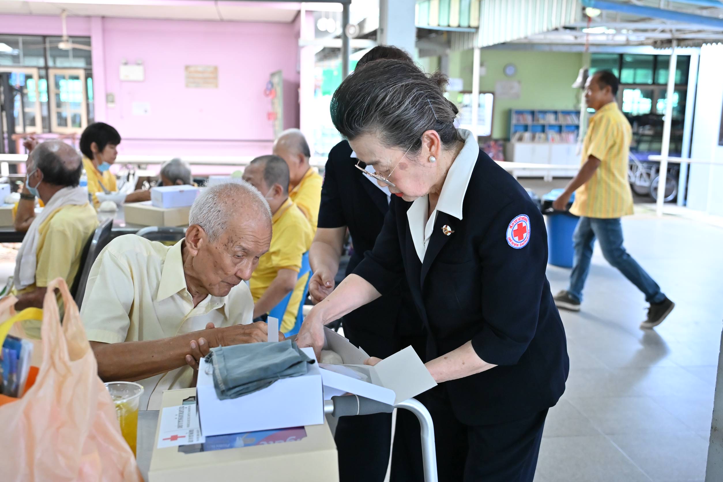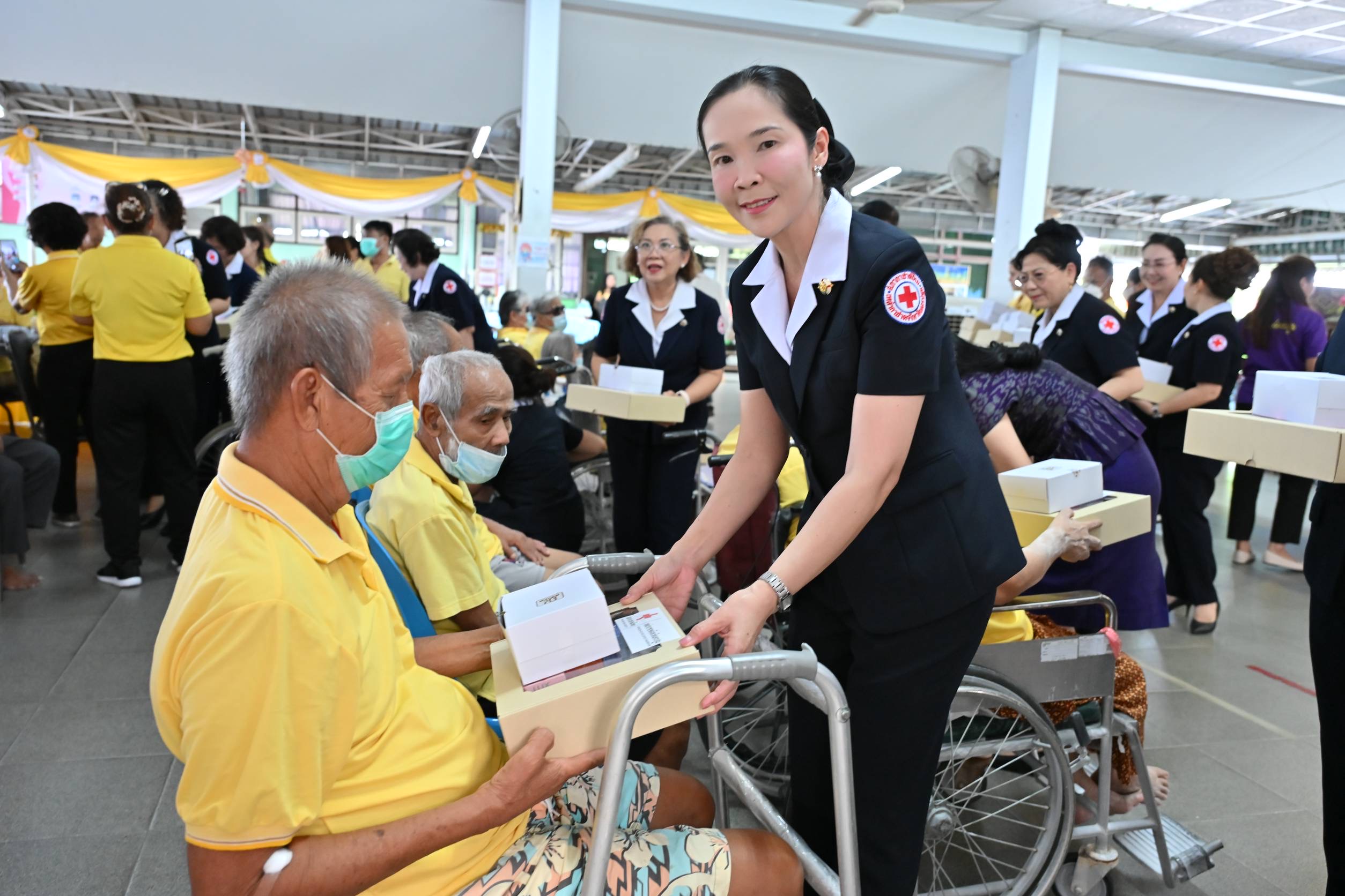 เนื่องด้วยสังคมไทยในปัจจุบัน ได้มีการเปลี่ยนแปลงไปจากเดิม ทั้งทางด้านเศรษฐกิจ สังคม การเมืองและวัฒนธรรม จากสถานการณ์ดังกล่าว ได้ส่งผลให้ กลุ่มผู้สูงอายุต้องประสบปัญหา การถูกทอดทิ้งให้อยู่เพียงตามลำพัง เกิดภาวะซึมเศร้า บุตรหลานไม่มีเวลาดูแล จำเป็นต้องส่งให้ไปอยู่ในความดูแลของ สถานสงเคราะห์ หรือบ้านพักคนชรา ที่อยู่ในวัยไล่เลี่ยกัน เพื่อเป็นกำลังใจ ให้ผู้สูงอายุให้มีกำลังใจในการดำเนินชีวิต และได้รับการดูแลทางด้านร่างกาย และจิตใจ เหล่ากาชาดจังหวัดนครปฐม จึงได้จัดทำโครงการเลี้ยงอาหารผู้สูงอายุในสถานสงเคราะห์คนชรา จำนวน 2 แห่ง ประกอบด้วย สถานสงเคราะห์คนชรานครปฐม ตำบลสนามจันทร์ อำเภอเมืองนครปฐม จำนวนผู้สูงอายุ 60 คน และสถานสงเคราะห์คนชราเฉลิมราชกุมารี (หลวงพ่อเปิ่นอุปถัมภ์) ตำบลวัดสำโรง อำเภอนครชัยศรี จำนวนผู้สูงอายุ 59 คน รวม 2 แห่ง จำนวนทั้งสิ้น 119 คน สำหรับในวันนี้ เป็นการจัดกิจกรรมเลี้ยงอาหารเป็นก๋วยเตี๋ยว ผลไม้ และไอศกรีม พร้อมมอบชุดของขวัญที่เป็นของใช้ในชีวิตประจำวันให้กับผู้สูงอายุ เพื่อเป็นกำลังใจ ให้ผู้สูงอายุให้มีกำลังใจในการดำเนินชีวิต และได้รับการดูแลทางด้านร่างกาย และจิตใจอีกด้วย