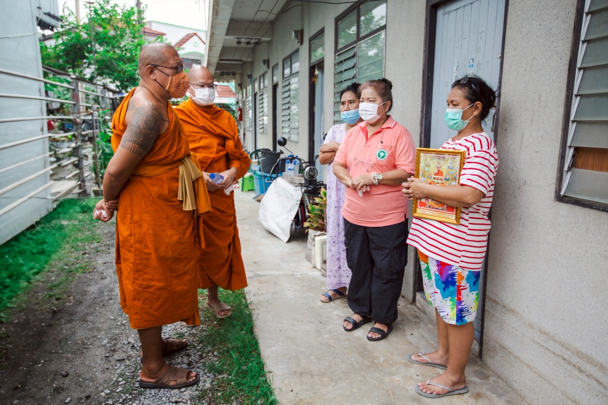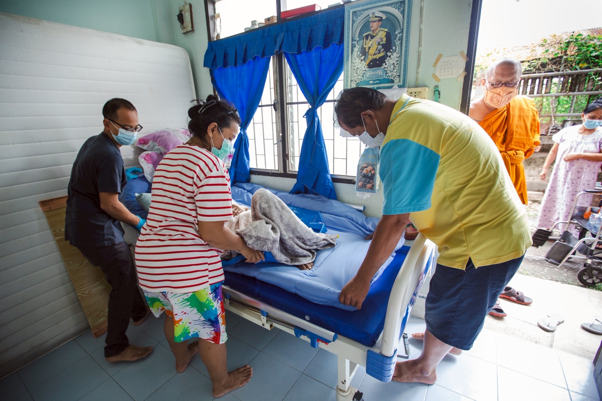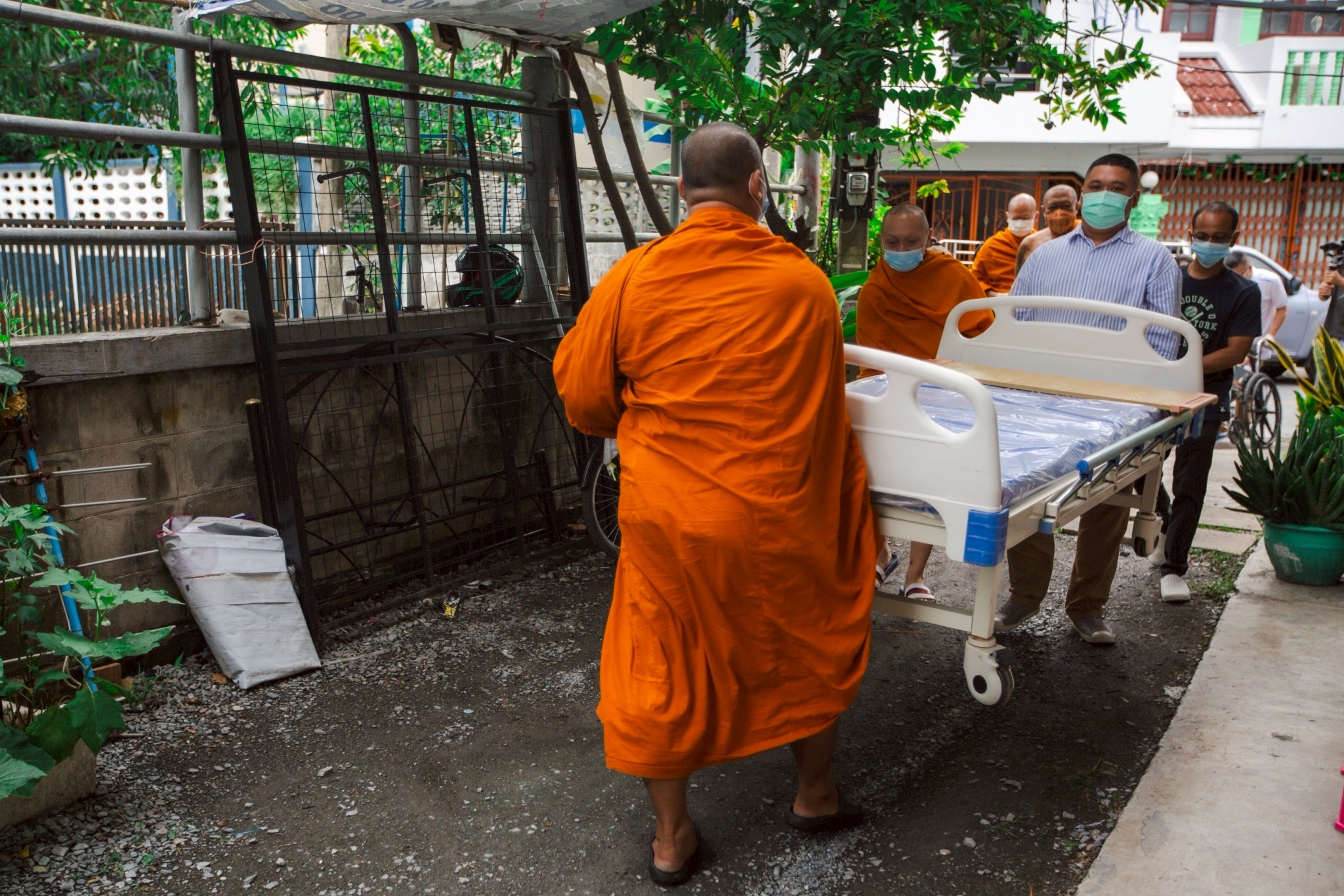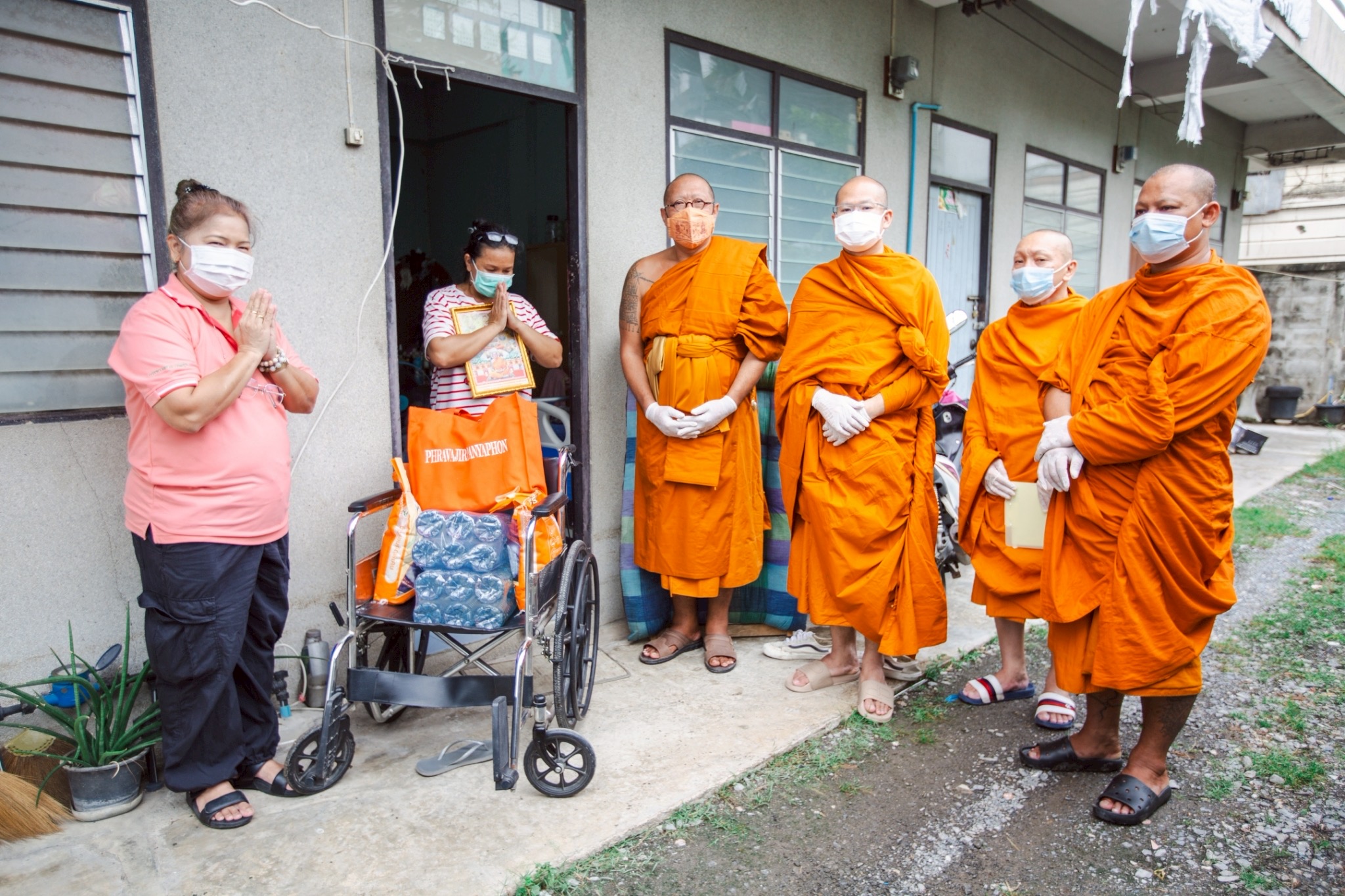 พระครูปลัดสิทธิวัฒน์ หลวงพี่น้ำฝน ผู้รักษาการแทนเจ้าอาวาสวัดไผ่ล้อม พระอารามหลวง จังหวัดนครปฐม ได้ประสานความร่วมมือกับพระวชิรปัญญาภรณ์ ผู้ช่วยเจ้าอาวาสวัดไร่ขิง พระอารามหลวง และนางพัชรี เกษรบุนนาค เป็นรองผู้อำนวยการโรงพยาบาลสามพราน ลงพื้นที่เพื่อนำเตียงและรถวีลแชร์สำหรับผู้ป่วย เครื่องดำรงชีพและปัจจัยเพื่อมอบให้และสอบถามปัญหาในการดำเนินชีวิต ผ่านการร่วมมือกันภายใต้โครงการธนาคารเตียงเสบียงแห่งกำลังใจ