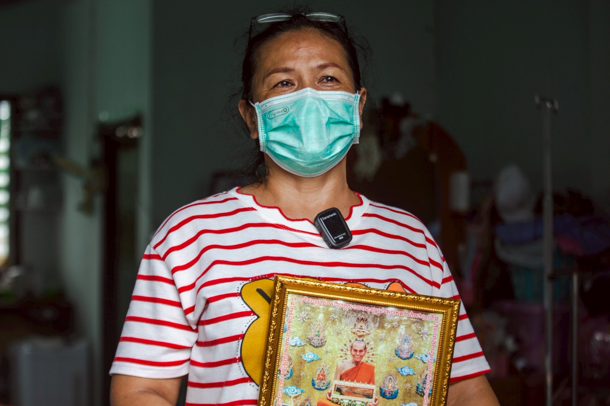 นางสาวดาวเรือง สนองผัน อายุ 49 ปี บอกว่าทราบข่าวเกี่ยวกับเรื่องธนาคารเตียงและรถวีลแชร์จากลูกสาวซึ่งตนเองตอนนี้ได้ออกจากงานและ รับมาทำหน้าที่ดูแลแม่ตลอด 24 ชั่วโมงหลังจากรับตัวออกจากโรงพยาบาลซึ่งปกติแม่ซึ่งเราเป็นผู้สูงวัยก็จะชอบอยู่คนเดียวแต่นับจากนี้จะจะต้องมีการดูแลให้มากขึ้น วันนี้รู้สึกประทับใจที่หลวงพี่น้ำฝนและท่านเจ้าคุณอ๋อได้ลงมาเยี่ยมเยียนและนำเตียงรวมถึงรถวีลแชร์ปัจจัยและเครื่องยังชีพมามอบให้ตัวเองรู้สึกซาบซึ้งและขอบคุณกับคณะสงฆ์ที่ได้ร่วมกันเข้ามาให้การช่วยเหลือเพราะปัจจุบันรายได้ที่น้องน้องได้รวบรวมเงินกันมาเดือนละ 8000 บาทสำหรับการจ่ายค่าห้องเช่าและการดูแลมารดา รวมถึงตัวเองที่จะต้องออกจากงานมาดูแลแม่เต็มที่ก็ไม่เพียงพอการที่คณะสงฆ์ไม่ทอดทิ้งและได้ประสานงานโรงพยาบาลสามพรานเข้ามาดูแลเป็นสิ่งที่ประทับใจและปลื้มใจ