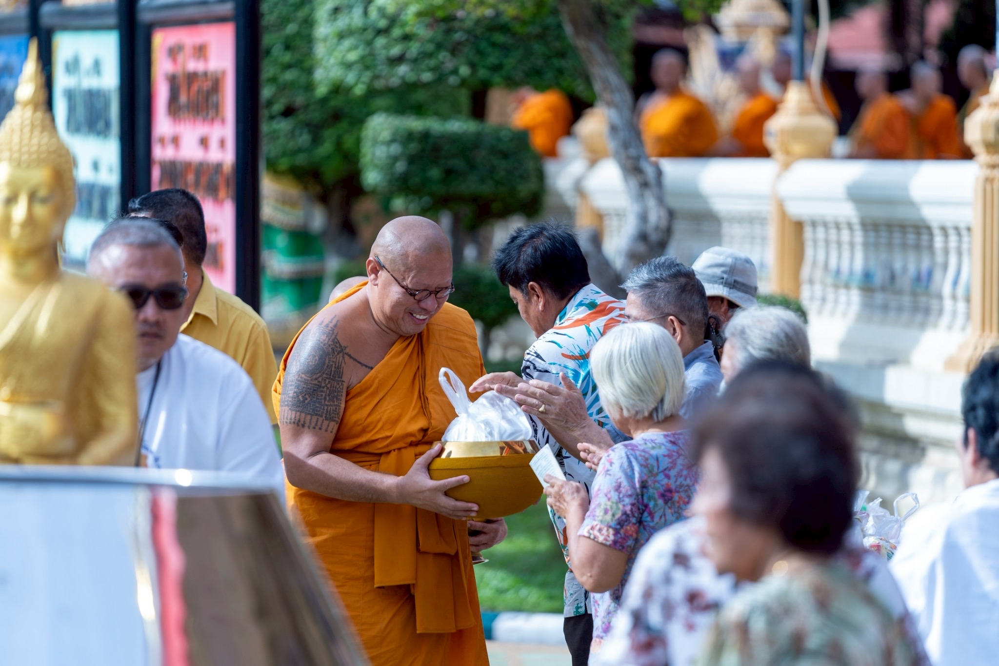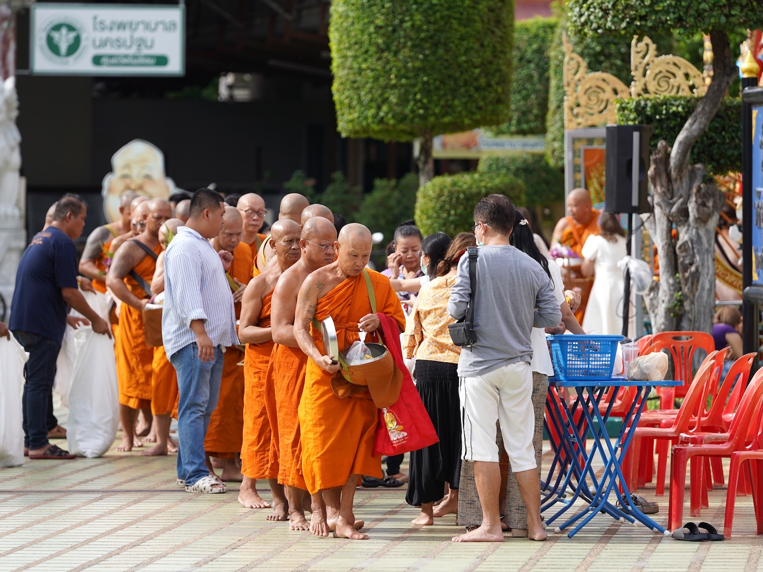 พุทธศาสนิกชน พร้อมใจตักบาตรเทโวโรหณะ ลานหน้าวัดไผ่ล้อม พระอารามหลวง จังหวัดนครปฐม เนื่องในโอกาสวันออกพรรษา ประจำปี 2568 หลวงพี่น้ำฝน นำคณะสงฆ์ปวารณาตน น้อมเผยแพร่พระพุทธศาสนาปฏิบัติตนอยู่ในพระธรรมคำสั่งสอน ประกาศต่อหน้าญาติโยมสิ่งของที่รับจากบาตรวันนี้จัดมอบถึงผู้ยากไร้และขาดโอกาสในสังคม เป็นการร่วมร่วมกันระหว่างบ้านวัดโรงเรียน เพื่อการอยู่ร่วมกันอย่างโอบอ้อมอารี