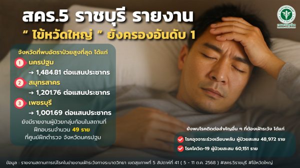 สำนักงานป้องกันควบคุมโรคที่ 5 จังหวัดราชบุรี รายงานสถานการณ์โรคติดต่อในพื้นที่ 8 จังหวัดเขตสุขภาพที่ 5 (ราชบุรี นครปฐม กาญจนบุรี เพชรบุรี ประจวบคีรีขันธ์ สมุทรสาคร สมุทรสงคราม และสุพรรณบุรี) ประจำสัปดาห์ที่ 41 (5–11 ตุลาคม 2568) พบว่า