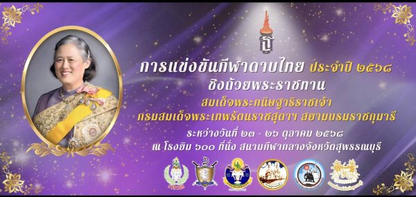 ผู้ช่วยศาสตราจารย์คมกริช ฆ้องนำโชค รองอธิการบดีมหาวิทยาลัยการกีฬาแห่งชาติ ประจำวิทยาเขตสุพรรณบุรี เปิดเผยว่า สมาคมกีฬาดาบไทยและกระบี่กระบอง โดยนายสภลท์ บุญเสริมสุข นายกสมาคมฯได้นำความกราบบังคมทูล สมเด็จพระกนิษฐาธิราชเจ้า กรมสมเด็จพระเทพรัตนราชสุดาฯ สยามบรมราชกุมารี ขอพระราชทานถ้วยรางวัล จำนวน 8 ถ้วย สำหรับเป็น ถ้วยรางวัลชนะเลิศในการแข่งขันกีฬาดาบไทย ประจำปี 2568 ประเภททีมคะแนนรวมสูงสุด รุ่นเยาวชนอายุไม่เกิน 18 ปี และรุ่นประชาชนทั่วไป ชาย – หญิง ทั้งนี้ เพื่อเป็นเกียรติและสิริมงคลแก่ผู้มีส่วนร่วมในคณะกรรมการจัดการแข่งขัน และนักกีฬาทุกคน เมื่อวันที่ 8 สิงหาคม พุทธศักราช 2568 ราชเลขานุการในพระองค์ ได้นำความกราบบังคมทูลทรงทราบฝ่าละอองพระบาทแล้ว ทรงพระกรุณาโปรดเกล้าฯ พระราชทาน และใช้สำหรับการแข่งขันในครั้งนี้