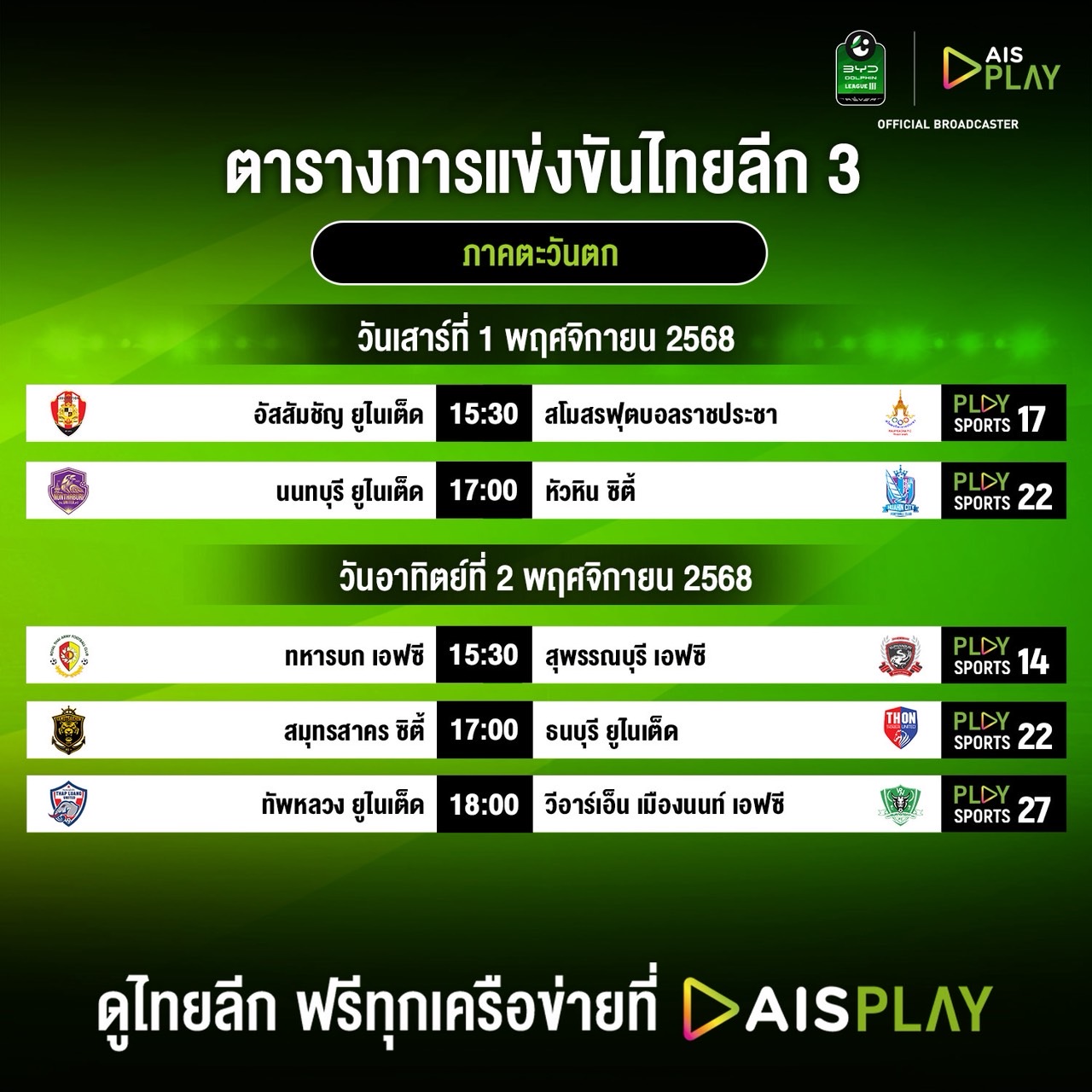 ไฮไลท์ของโซนภาคตะวันตกคงหนีไม่พ้นการเจอกันของ 2 ทีมหัวตาราง โดย “พยัคฆ์สาคร ” สมุทรสาคร ซิตี้ รองจ่าฝูงของโซน จะเปิดบ้านรับการมาเยือนของ “ม้าศึกฝั่งธน” ธนบุรี ยูไนเต็ด“ ทีมนำของโซนตะวันตก ที่สนามม.การกีฬาแห่งชาติวิทยาเขตสมุทรสาคร ในวันอาทิตย์ที่ 2 พฤศจิกายน เวลา 17.00 น. ถ่ายทอดสดทาง AIS PLAY SPORTS22