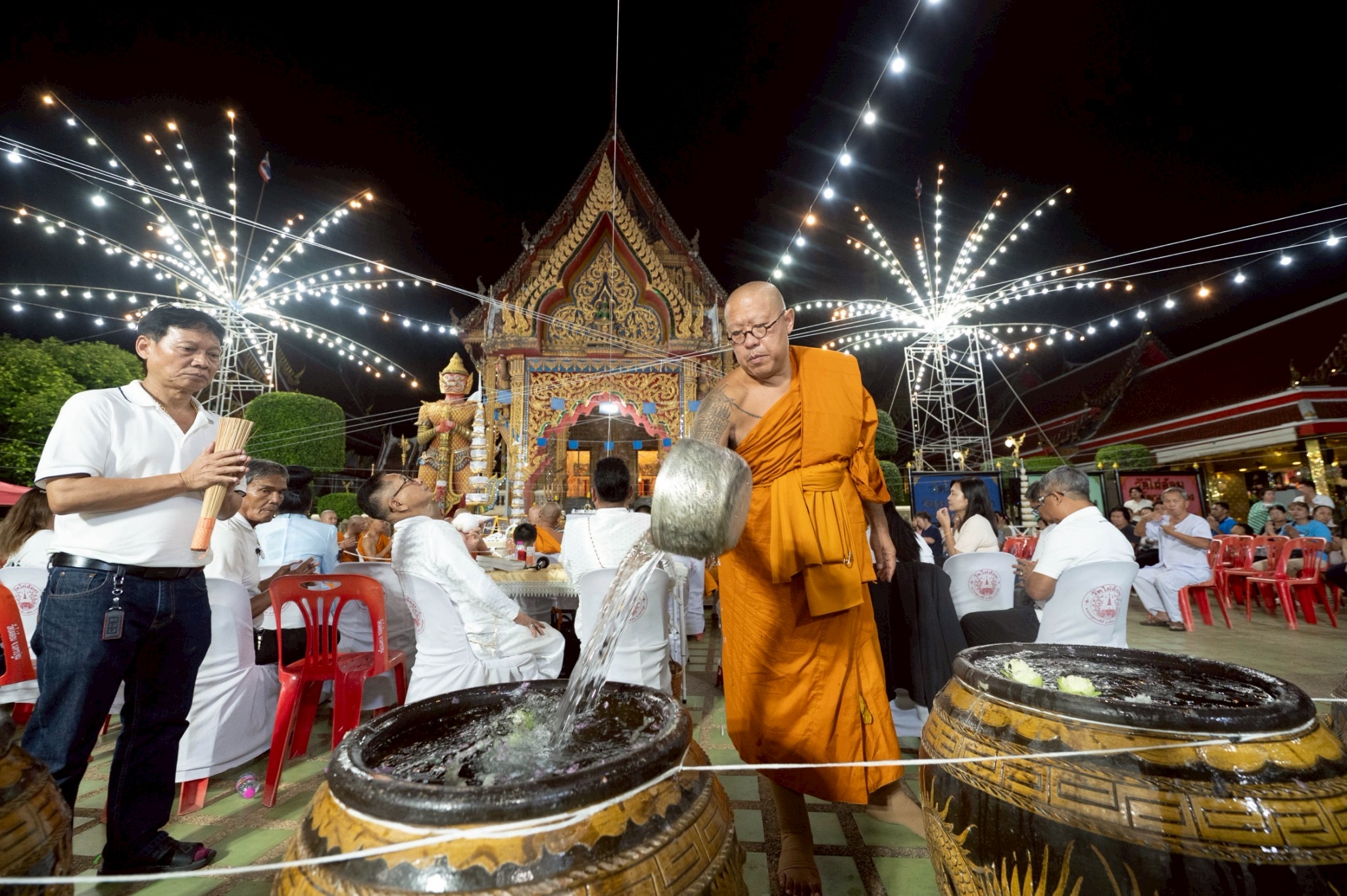 ปิดท้ายด้วยเวลา 00.00 น. เป็นช่วงเวลาที่แสงแห่งดวงจันทร์ เปล่งแสงได้สว่างไสวที่สุด และเป็นช่วงที่มืดที่สุดในยามราตรี จึงได้สืบสานพิธีอาบน้ำคืนเพ็ญ ตำรับหลวงพ่อพูล สะเดาะเคราะห์ เสริมสิริมงคล คืนลอยกระทง ล้างทุกข์ ล้างโศก ล้างภัย โดยเป็นพิธีที่สืบสานกันมาจากตำรับดั้งเดิมของหลวงพ่อพูล โดยมีคณะสงฆ์เจริญพระพุทธมนต์ ต่อเนื่องตั้งแต่ พระอาทิตย์ตกดิน