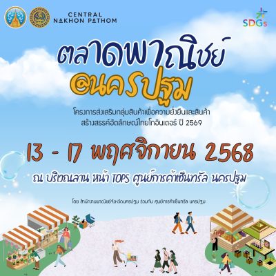 จังหวัดนครปฐม โดยสำนักงานพาณิชย์จังหวัดนครปฐม ร่วมกับ ศูนย์การค้าเซ็นทรัล นครปฐม ขอเชิญชวนประชาชนและนักท่องเที่ยวเที่ยว ร่วมชมและเลือกซื้อสินค้าภายในงาน “ตลาดพาณิชย์ @นครปฐม” จุดจำหน่ายสินค้าและของอร่อยนครปฐม ภายใต้โครงการส่งเสริมกลุ่มสินค้าเพื่อความยั่งยืนและสินค้าสร้างสรรค์อัตลักษณ์ไทยโกอินเตอร์ ปี 2569
