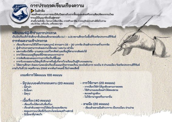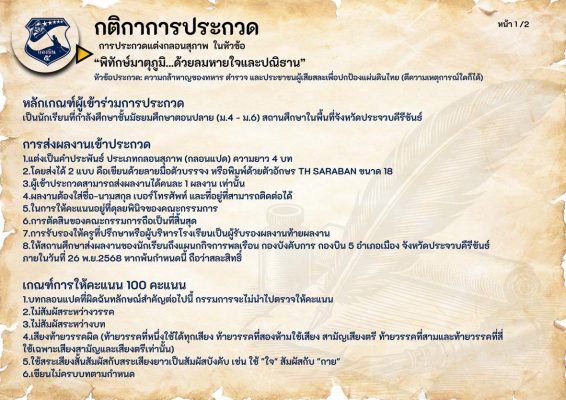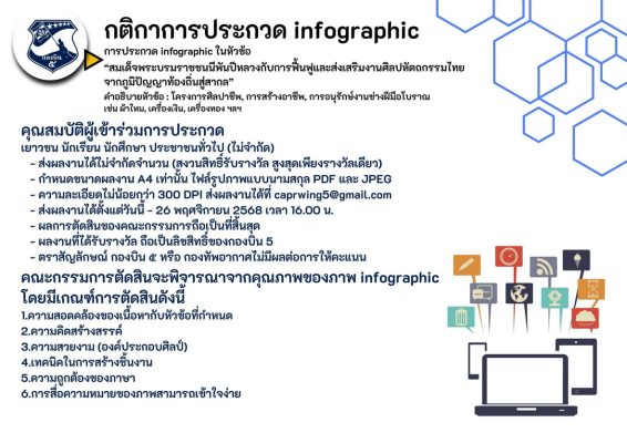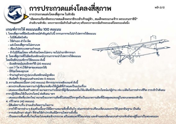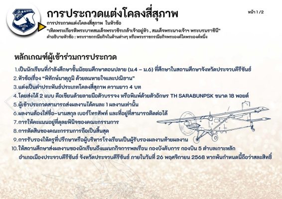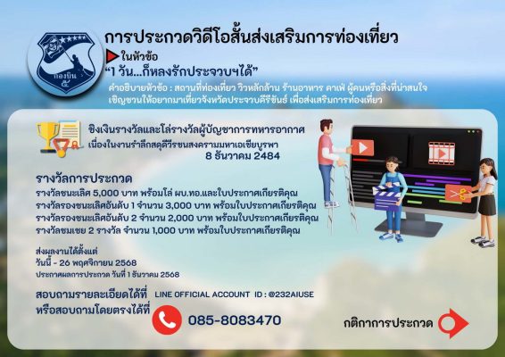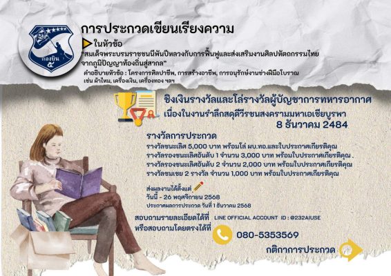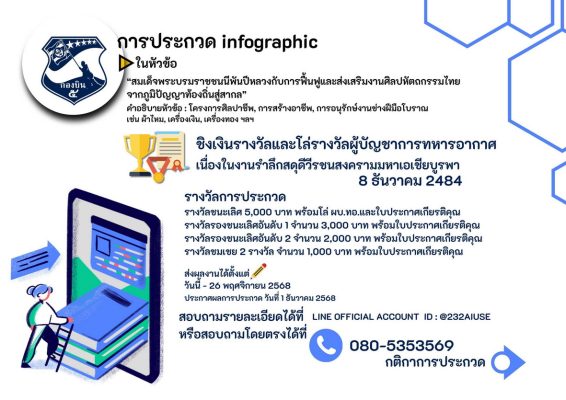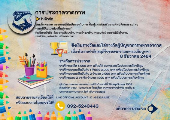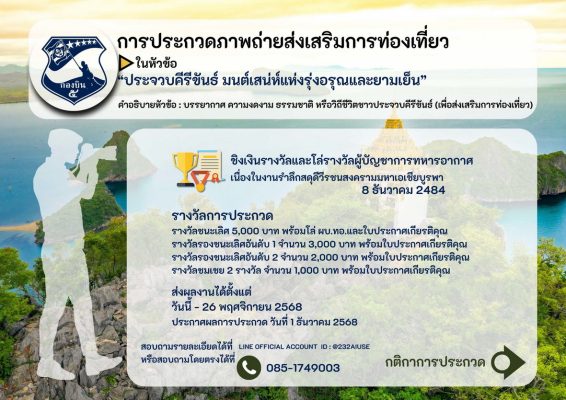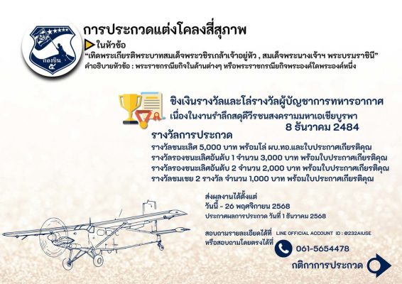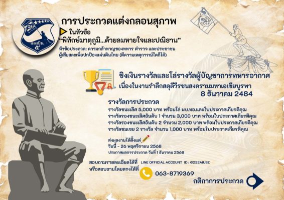 ทั้งนี้ในกิจกรรมการประกวดทั้ง 7 กิจกรรม มีโล่เกียรติยศ ผู้บัญชาการทหารอากาศ และเงินรางวัลดังนี้ ชนะเลิศทุกการประกวด ที่ 1 ได้เงิน 5,000 บาท ที่ 2 ได้เงิน 3,000 บาท ที่ 3 มี 2 รางวัล รางวัลละ 2,000 บาท และรางวัลชมเชยมี 2 รางวัล รางวัลละ 1,000 บาท ส่งผลงานการประกวดได้ตั้งแต่วันนี้ ถึงวันที่ 26 พ.ย.2568 และจะประกาศผลในวันที่ 1 ธันวาคม 2568 ติดต่อสอบถาม ได้ที่ 063-8719369
