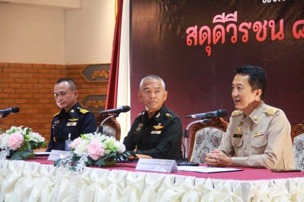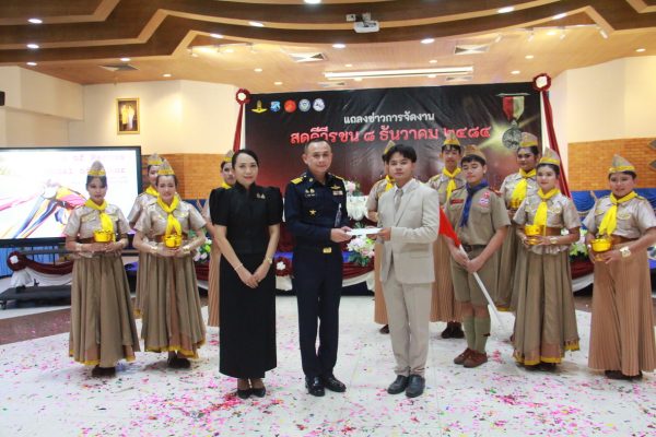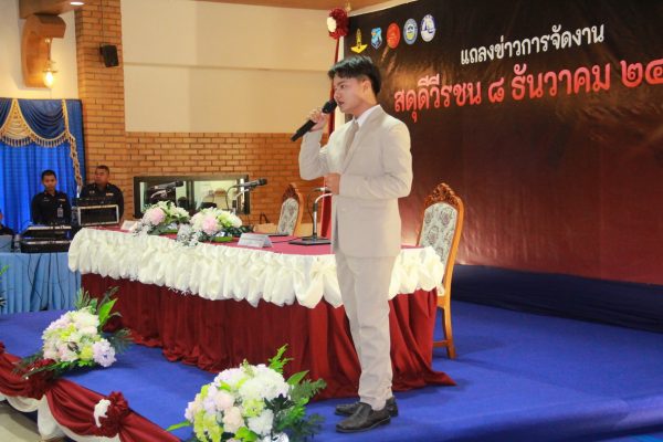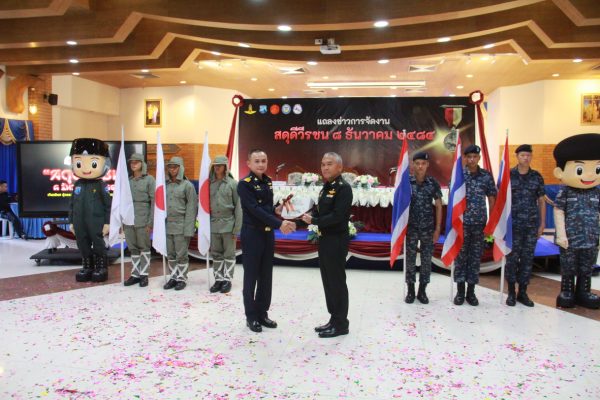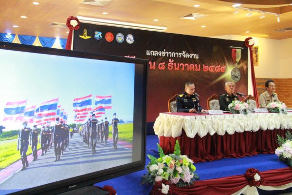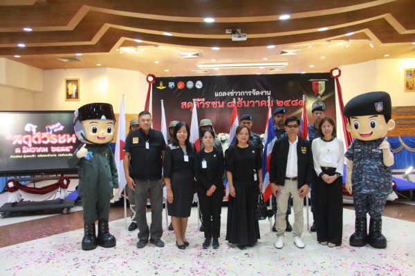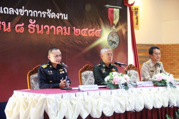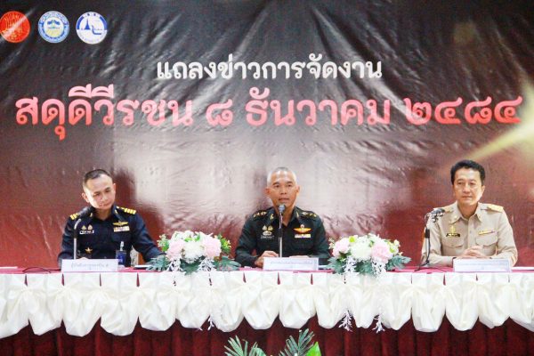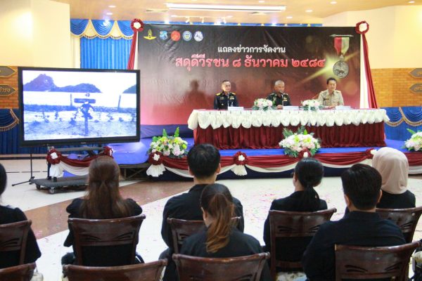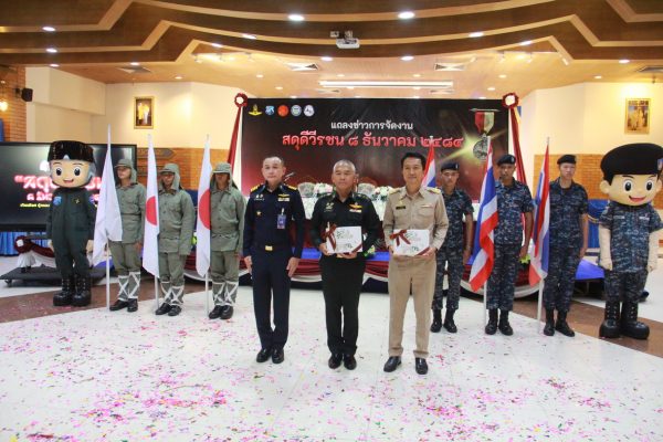 เมื่อเวลา 16.00 น. วันที่ 12 พ.ย.2568 ที่ห้องดุสิตา อาคารอากาศคำรณ กองบิน 5 อ.เมือง จ.ประจวบคีรีขันธ์ น.อ.รัตนศักดิ์ โพธิ์แก้ว ผู้บังคับการกองบิน 5 พร้อม พ.อ.วีระชัย ศิระสากร รองผู้อำนวยการรักษาความมั่นคงภายใน (รมน.) จังหวัดประจวบฯ (ผู้แทน นายสิทธิชัย สวัสดิ์แสน ผู้ว่าฯ จ.ประจวบฯ) นายสราวุธ ลิ้มอรุณรักษ์ นายกองค์การบริหารส่วนจังหวัดฯ ได้ร่วมแถลงข่าวการจัดงาน “สดุดีวีรชน 8 ธันวาคม 2484” ประจำปี 2568 โดยมี น.ส.นลิน มาคเชนทร์ ประชาสัมพันธ์จังหวัดฯ ร้อยโทสิทธิชัย ตัณฑสิทธิ์ ท่องเที่ยวและกีฬาจังหวัดฯ น.ส.สุชาดา ธุมะลิ ผอ.สถานีวิทยุกระจายเสียงแห่งประเทศไทย(สวท.)ประจวบฯ หัวหน้าส่วนราชการ คณะผู้บังคับบัญชาประจำกองบิน 5 ผู้แทนหน่วยงาน ชมรมแม่บ้านทหารอากาศกองบิน 5 หัวหน้าหน่วยขึ้นตรงฯ ข้าราชการ เจ้าหน้าที่ทหารอากาศ และ สื่อมวลชนในพื้นที่ จ.ประจวบฯ เข้าร่วม