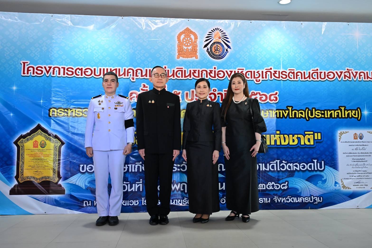 วันที่ 30 พฤศจิกายน 2568 ที่ห้องเตมียเวส ตึกบัญชาการโรงเรียนนายร้อยตำรวจ อำเภอสามพราน จังหวัดนครปฐม ม.ล.ปนัดดา ดิศกุล อดีตปลัดสำนักนายกรัฐมนตรี และเลขาธิการมูลนิธิศรีสวางควัฒน ในพระอุปถัมภ์ สมเด็จพระเจ้าน้องนางเธอ เจ้าฟ้าจุฬาภรณวลัยลักษณ์ อัครราชกุมารี กรมพระศรีสวางควัฒน วรขัตติยราชนารี เป็นประธานมอบใบประกาศเกียรติคุณและโล่ประกาศเกียรติคุณ โครงการตอบแทนคุณแผ่นดินยกย่องเชิดชูเกียรติคนดีของสังคม ครั้งที่ 5 ประจำปี 2568 โดยมีนางสาวอโรชา นันทมนตรี ผู้ว่าราชการจังหวัดนครปฐม ให้การต้อนรับ