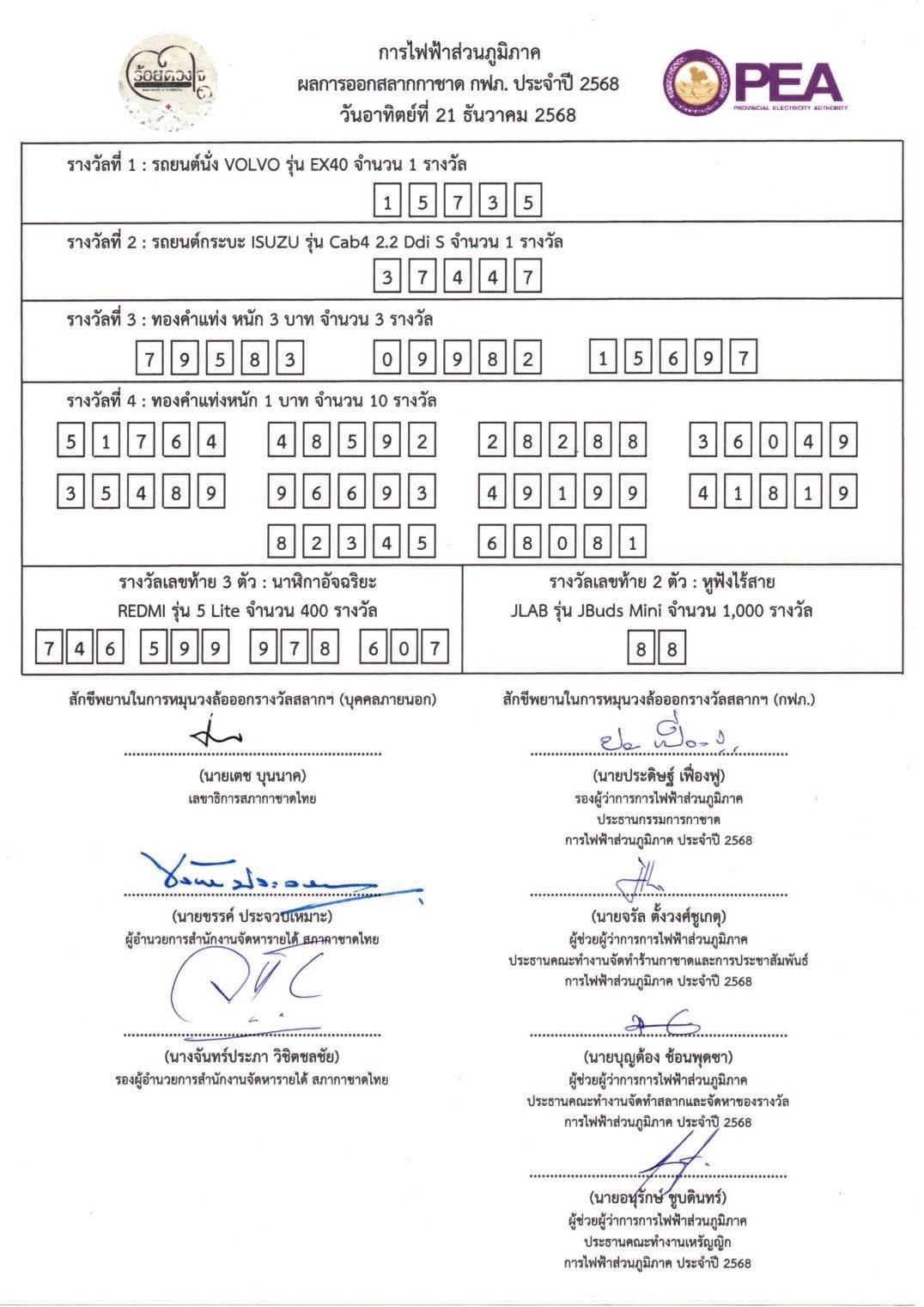 โทรศัพท์ 0-2590-5696 หรือสำนักงานการไฟฟ้าส่วนภูมิภาคเขตและจังหวัดทุกแห่ง ภายในวันจันทร์ที่ 23 มีนาคม 2569 ในเวลาราชการ (หลังจากพ้นกำหนดแล้วถือว่าสละสิทธิ์ในการรับรางวัล)