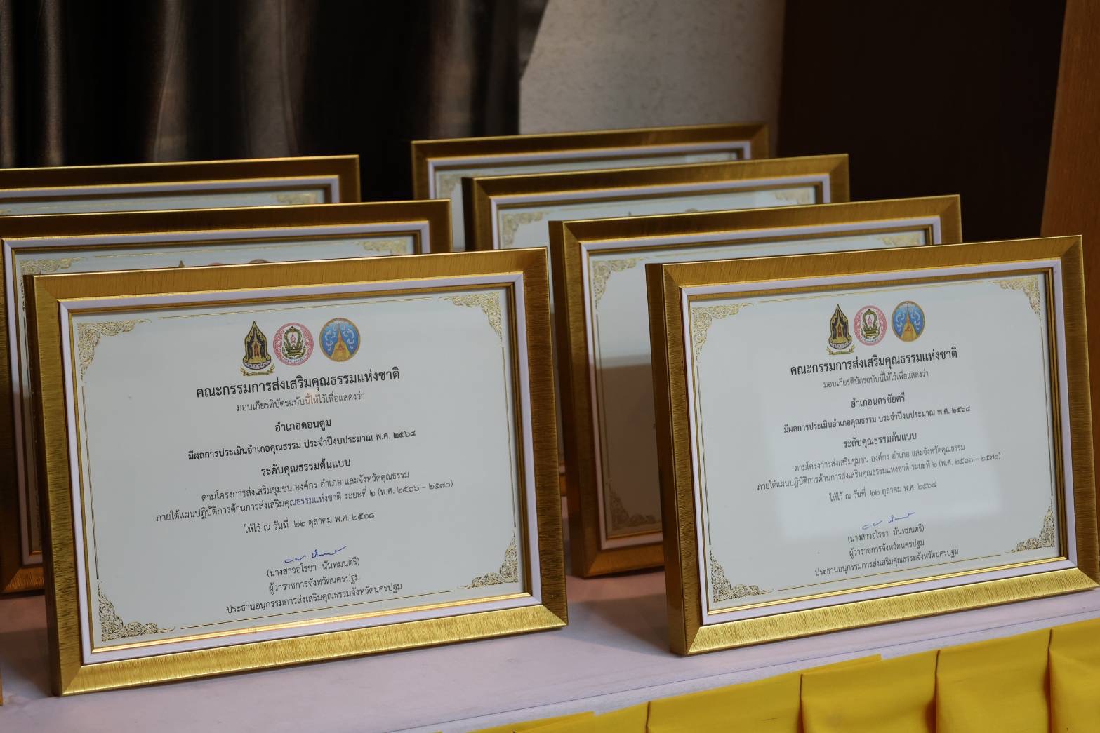 ด้วยในปีงบประมาณ พ.ศ. 2568 กรมการศาสนากระทรวงวัฒนธรรม ร่วมกับจังหวัดนครปฐม ดำเนินการประเมินชุมชน องค์กร อำเภอคุณธรรม ระดับส่งเสริมคุณธรรม ระดับพัฒนาคุณธรรม และระดับคุณธรรมต้นแบบ ซึ่งจะได้รับเกียรติบัตรจากประธานอนุกรรมการส่งเสริมคุณธรรมระดับจังหวัดเพื่อเป็นขวัญและกำลังใจให้กับหน่วยงานต่าง ๆ ในการร่วมกันขับเคลื่อนงานตามแผนปฏิบัติการด้านการส่งเสริมคุณธรรมแห่งชาติ ระยะที่ 2 (พ.ศ. 2566 – 2570) ที่มุ่งส่งเสริม ให้คนไทยมีพฤติกรรมที่สะท้อนการมีคุณธรรมเพิ่มขึ้น มุ่งสู่สังคมคุณธรรม อยู่ร่วมกันด้วยความสมานฉันท์ ภายใต้หลักธรรมคำสอนทางศาสนา หลักปรัชญาของเศรษฐกิจพอเพียงวิถีวัฒนธรรมไทย และคุณธรรม 5 ประการ พอเพียง วินัย สุจริต จิตอาสา กตัญญู ผลการประเมินมีชุมชนคุณธรรมจำนวน 305 ชุมชน องค์กรคุณธรรม จำนวน 65 องค์กร และอำเภอคุณธรรมจำนวน 7 อำเภอ นอกจากนี้ยังมีชุมชน องค์กร และอำเภอคุณธรรมต้นแบบโดดเด่นซึ่งจะได้รับโล่ กับรัฐมนตรีว่าการกระทรวงวัฒนธรรมในโอกาสต่อไป