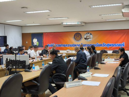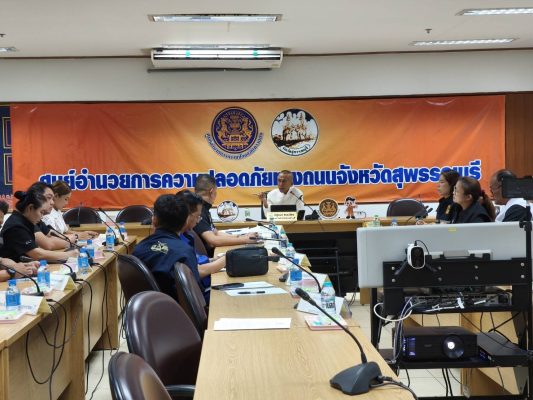 วันนี้( 3 ม.ค.69 ) เวลา 08.30 น. ที่ห้องประชุมพลายแก้ว ศาลากลาง จังหวัดสุพรรณบุรี นายณัฐพงษ์ สงวนจิตร ผู้ว่าราชการจังหวัดสุพรรณบุรี เป็นประธานการประชุมศูนย์ปฏิบัติการป้องกันและลดอุบัติเหตุทางถนนช่วงเทศกาลปีใหม่ 2569 จังหวัดสุพรรณบุรี โดยมีส่วนราชการที่เกี่ยวข้องเข้าร่วมประชุม เพื่อระดมความเห็นการรณรงค์ในห้วง 4 วันที่ผ่านมา