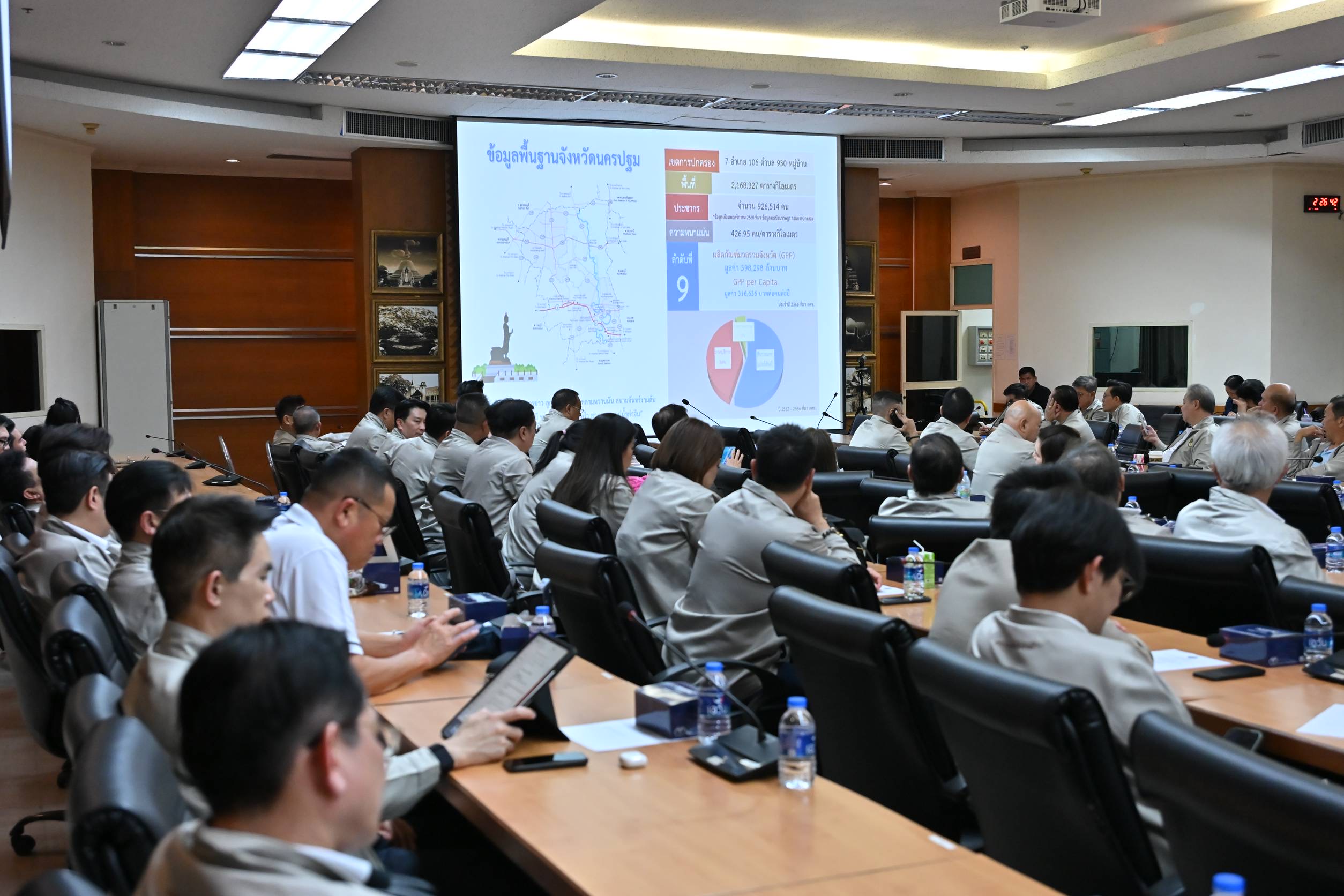 โอกาสนี้ คณะนักศึกษาหลักสูตรประกาศนียบัตรชั้นสูงการเมืองการปกครองระบอบประชาธิปไตย สำหรับนักบริหารระดับสูง รุ่นที่ 29 รับฟังบรรยายสรุปเรื่อง ภาพรวมนโยบายด้านสิ่งแวดล้อมของจังหวัดนครปฐม , การขับเคลื่อนนโยบายด้านสิ่งแวดล้อมของจังหวัด สถานการณ์สิ่งแวดล้อมจังหวัด และการบริหารจัดการ, กลไกกฎหมายในการแก้ไขปัญหาสิ่งแวดล้อม และการส่งเสริมอุตสาหกรรมที่เป็นมิตรกับสิ่งแวดล้อม