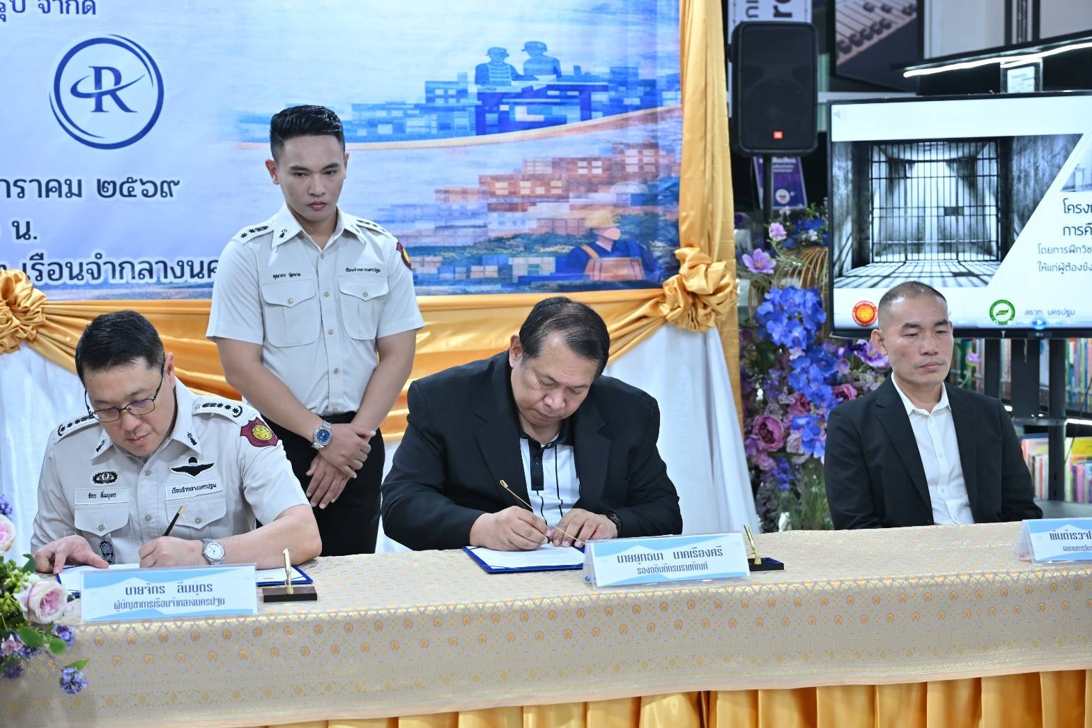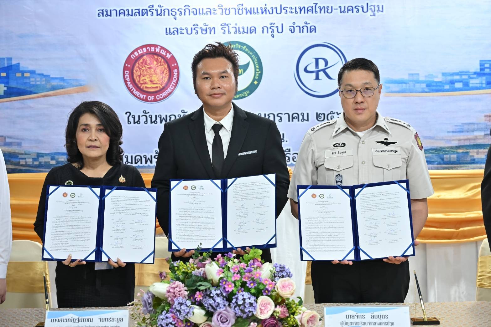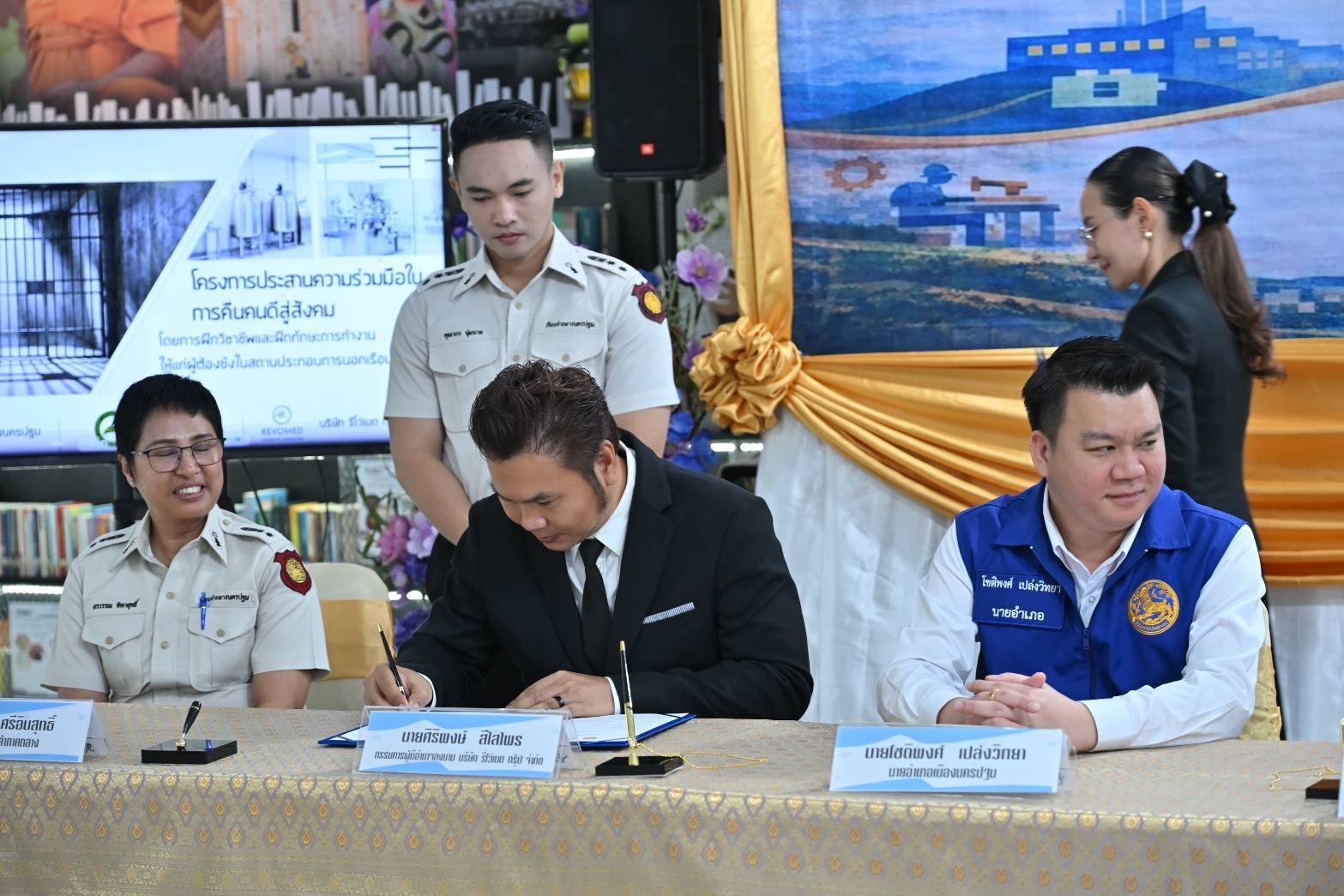 เรือนจำกลางนครปฐม ร่วมกับ สมาคมสตรีนักธุรกิจและวิชาชีพแห่งประเทศไทย-นครปฐม และ บริษัท รีโว่เมด กรุ๊ป จำกัด สาขาบางเลน ลงนามบันทึกข้อตกลงความร่วมมือ โครงการฝึกวิชาชีพ และฝึกทักษะการทำงานให้แก่ผู้ต้องขังในสถานประกอบการนอกเรือนจำ เพื่อให้ผู้ต้องขังมีรายได้เลี้ยงตนเองระหว่างต้องโทษ