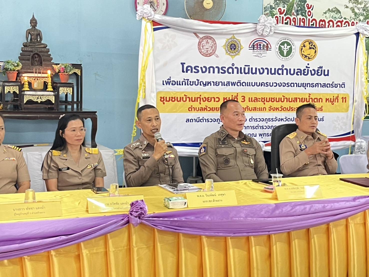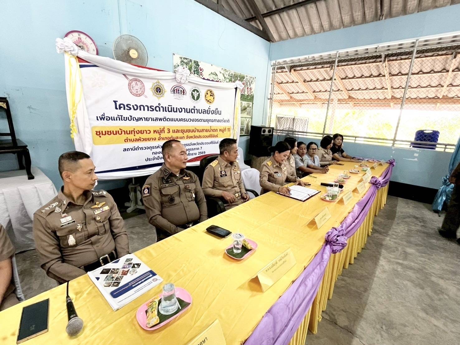 สำหรับการดำเนินงาน“โครงการตำบลยั่งยืนเพื่อแก้ไขปัญหายาเสพติดแบบครบวงจรตามยุทธศาสตร์ชาติ ประจำปีงบประมาณ 2569” สถานีตำรวจภูธรห้วยยาง จว.ประจวบคีรีขันธ์ ได้กำหนดชุมชนเป้าหมาย 2 ชุมชน คือ บ้านทุ่งยาว ม.3 และบ้านน้ำตกสายหนึ่ง ม.11 ต.ห้วยยาง อ.ทับสะแก โดยมีเป้าหมายในการดำเนินการค้นหาผู้ใช้ ผู้เสพ ผู้ติดยาเสพติดในชุมชน โดยการ x-ray คนในชุมชนอายุเป้าหมาย 12-65 ปี เพื่อนำมาบำบัดรักษาในชุมชนด้วยกระบวนการ CBTx เพื่อ ลด-ละ-เลิกยาเสพติด โดยมีภาคีเครือข่ายเข้าร่วมสนับสนุนในโครงการ อาทิ สาธารณสุข ปกครอง ท้องถิ่น และตำรวจ ถือเป็น 4 เสาหลักของโครงการ และมีท่านนายอำเภอทับสะแก เป็นเสาเอกของโครงการ ช่วยกำกับดูแลหน่วยงานในปกครองอย่างดี ทั้งนี้โครงการดังกล่าวจะประสบความสำเร็จตามเจตนารมณ์ได้ ต้องได้รับความร่วมมือร่วมใจของคนในชุมชนที่สำคัญ คณะกรรมการคุ้มทุกคน จะเป็นผู้ช่วยสำคัญในการขับเคลื่อนโครงการ พ.ต.อ.วีระพัฒน์ เกตุษาผกก.สภ.ห้วยยาง กล่าวไว้