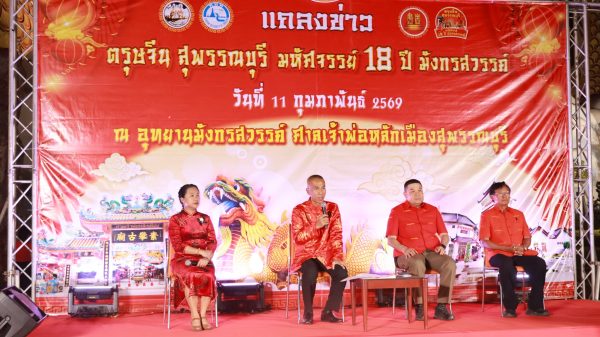 วันนี้ (11 ก.พ.69) เวลา 18.00 น. ที่ศาลาเทียนอันเหมิน อุทยานมังกรสวรรค์ พิพิธภัณฑ์ลูกหลานพันธุ์มังกร ศาลเจ้าพ่อหลักเมืองสุพรรณบุรี นายณัฐพงษ์ สงวนจิตร ผู้ว่าราชการจังหวัดสุพรรณบุรี เป็นประธานการแถลงข่าวงาน “ตรุษจีนสุพรรณบุรี มหัศจรรย์ 18 ปี มังกรสวรรค์” ซึ่งกำหนดจัดขึ้น ระหว่างวันที่ 17-18 กุมภาพันธ์ 2569 ณ อุทยานมังกรสวรรค์ พิพิธภัณฑ์ลูกหลานพันธุ์มังกร ศาลเจ้าพ่อหลักเมืองสุพรรณบุรี อำเภอเมืองสุพรรณบุรี จังหวัดสุพรรณบุรี เพื่อเปิดโอกาสให้ประชาชนทั่วไป โดยจังหวัดสุพรรณบุรีร่วมกับ การท่องเที่ยวแห่งประเทศไทย และคณะกรรมการศาลเจ้าพ่อหลักเมืองสุพรรณบุรี ได้กำหนดจัดงานดังกล่าวขึ้น
