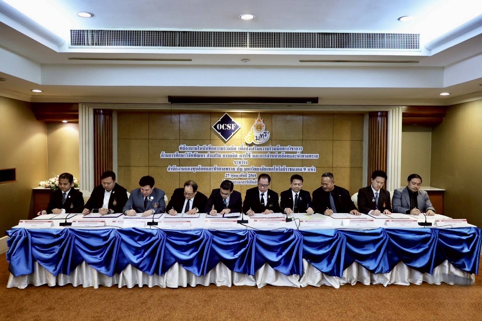 วันศุกร์ที่ 27 กุมภาพันธ์ 2569 มหาวิทยาลัยเทคโนโลยีราชมงคลรัตนโกสินทร์ นำโดย รศ.ดร.อุดมวิทย์ ไชยสกุลเกียรติ รักษาราชการแทนอธิการบดี (ประธาน ทปอ.มทร.) พร้อมด้วยคณะผู้บริหาร เข้าร่วมพิธีลงนามบันทึกความร่วมมือ (MOU) ระหว่าง สำนักงานกองทุนอ้อยและน้ำตาลทราย กับมหาวิทยาลัยเทคโนโลยีราชมงคลทั้ง 9 แห่ง ณ โรงแรมรามาการ์เด้นส์ กรุงเทพมหานคร เพื่อส่งเสริมความร่วมมือและสนับสนุนการพัฒนาด้านวิชาการ ด้านการศึกษา วิจัยพัฒนา ส่งเสริม การผลิต การใช้ และการจำหน่ายอ้อยและน้ำตาลทราย รวมถึงการเสริมสร้างศักยภาพระหว่างหน่วยงาน อันจะนำไปสู่การส่งเสริมการศึกษา วิจัย และพัฒนาอุตสาหกรรมอ้อยและน้ำตาลทรายให้สอดคล้องกับนโยบายของประเทศในด้านเศรษฐกิจ สังคม และสิ่งแวดล้อมอย่างยั่งยืน โดยมีเป้าหมายในการยกระดับคุณภาพความหวานของอ้อยและน้ำตาลทราย การประยุกต์ใช้นวัตกรรมการเกษตรเพื่อเพิ่มมูลค่าผลผลิต ตลอดจนการสนับสนุนแนวทาง Smart Farming ผ่านการเชื่อมโยงงานวิชาการ การเผยแพร่ข้อมูลข่าวสาร การแลกเปลี่ยนองค์ความรู้ การจัดกิจกรรมร่วมกัน และการสนับสนุนทุนวิจัยภายใต้กรอบกฎหมายที่เกี่ยวข้อง ทั้งนี้ ความร่วมมือดังกล่าวมีระยะเวลา 2 ปี นับแต่วันที่ลงนาม และถือเป็นกรอบความร่วมมือทางวิชาการเบื้องต้นที่ทั้งสองฝ่ายจะร่วมกันกำหนดรายละเอียดโครงการต่าง ๆ ให้เกิดผลเป็นรูปธรรมต่อไป