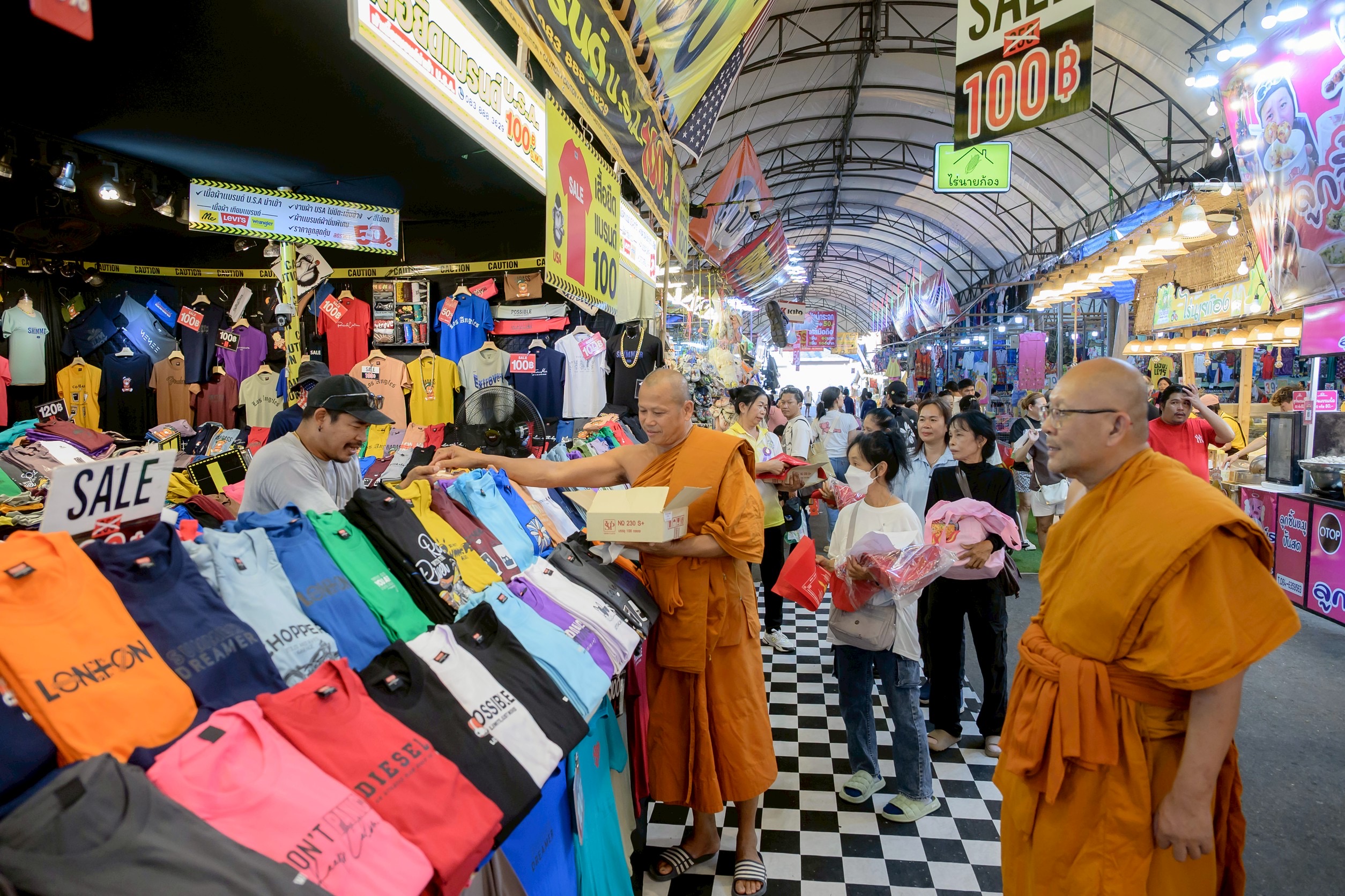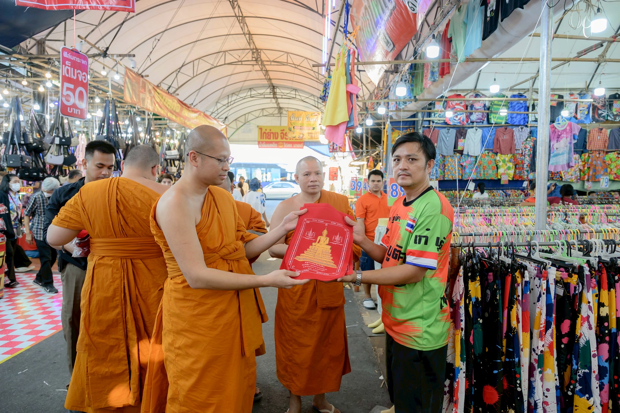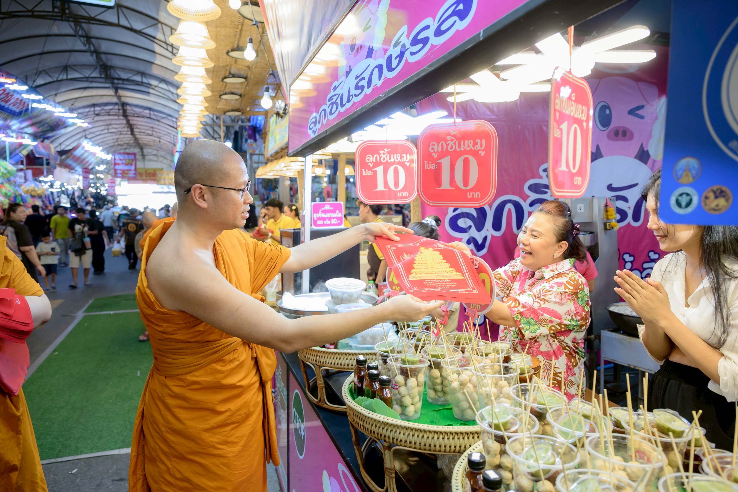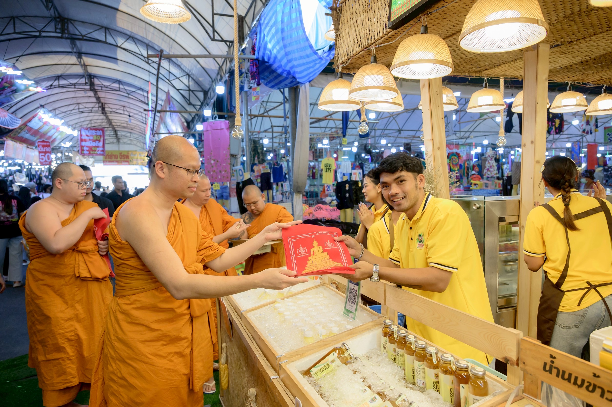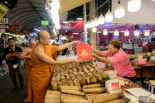 พ่อค้า แม่ค้าขายงานวัดไร่ขิง สุดปลื้ม ผู้ช่วยเจ้าอาวาสวัดไร่ขิง เดินแจกผ้ายันต์และวัตถุมงคลที่ระลึก งานประจำปีวันสุดท้าย