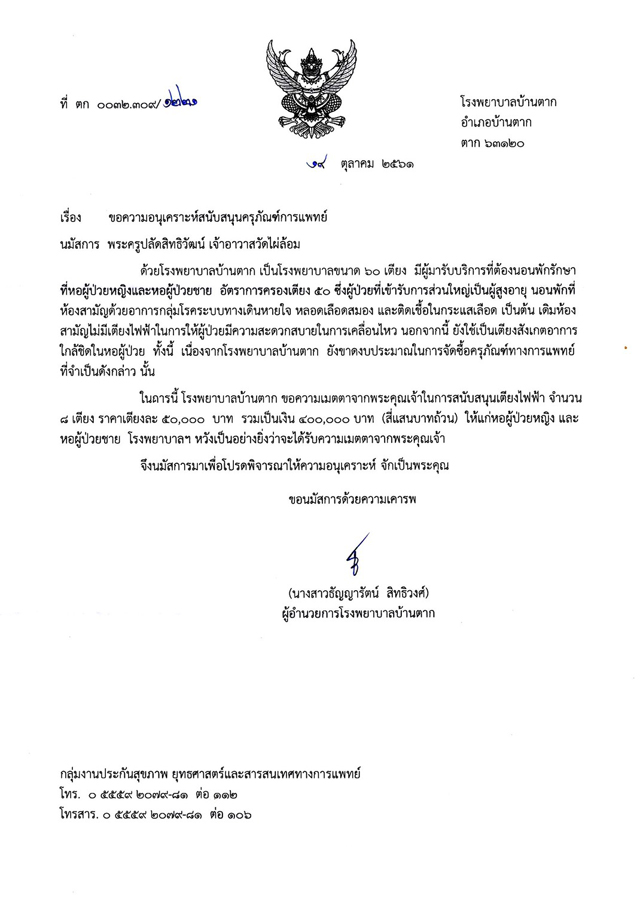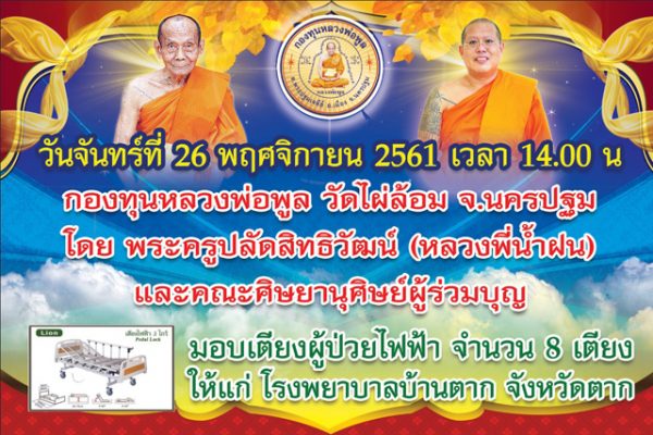 กองทุนหลวงพ่อพูล วัดไผ่ล้อม จ.นครปฐม โดย พระครูปลัดสิทธิวัฒน์ (หลวงพี่น้ำฝน) และคณะศิษยานุศิษย์ผู้ร่วมบุญ กำหนดมอบเตียงไฟฟ้าให้แก่โรงพยาบาลบ้านตาก จังหวัดตาก จำนวน 8 เตียง ในวันที่ 26 พฤศจิกายน พ.ศ.2561 เวลา 14.00 น ตามคำขออนุเคราะห์สนับสนุนคุรุภัณฑ์ทางการแพทย์
