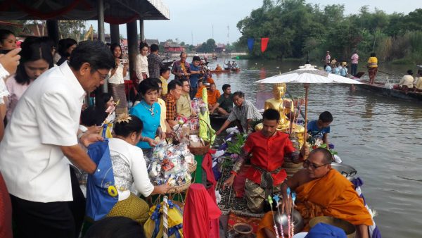 โดยขบวนเรือชักพระ มีแม่ขวัญจิตร ศรีประจันต์ ศิลปินแห่งชาติ สาขาเพลงพื้นบ้าน (เพลงอีแซว) นำคณะเพลงอีแซว ลงขบวนเรือขับร้อง พร้อมขบวนกลองยาว มีนางรำและชาวบ้าน ร่วมขบวน ปัจจุบันเป็นการจัดงานในวันแรม 12 ค่ำเดือน 12 จะไม่ตรงกับวันหยุด จึงได้เปลี่ยนประเพณีชักพระและตักบาตรกลางน้ำ เป็นวันอาทิตย์ ที่ 3 ของทุกเดือนพฤศจิกายน ของทุกปี การจัดงานประเพณี ชักพระเล่นเพลง ตักบาตรกลางน้ำ