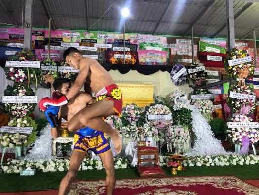 บรรยากาศงานสวดพระอภิธรรมก็ยังคงเป็นไปตามปกติเหมือนกับงานศพทั่วไป แต่ที่แปลกก็คือ มีการชกมวยในงานศพ โดยให้นักมวยซึ่งเป็นคู่เอก มาไหว้ครูมวยหน้าศพ และโชว์ลีลามวยไทยให้กับคุณยายเผือกและผู้ที่มาร่วมงานดู หลังเสร็จพิธีกรรมทางสงฆ์ ก็มีการชกจริงบนเวทีมวยทั่วไป มีทั้งประเภทมวยหญิง และมวยทั่วไป มีชาวบ้านสนใจเดินทางมาดูมวยกันเป็นจำนวนมาก ส่งเสียเชียร์กันอย่างสนุกสนาน