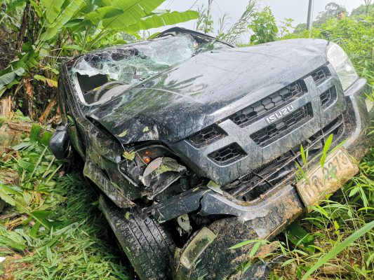 ร.ต.อ.สมพงศ์ สุดฉิม ร้อยเวรฯสภ.นาโยง รับแจ้งเหตุรถพลิกคว่ำคนติดในที่บริเวณ กม.1129 ถ.เพชรเกษม ช่วงตำบลช่อง ทางขึ้นเขาพับผ้า อ.นาโยง จ.ตรัง หลังรับแจ้งรีบประสานเจ้าหน้าที่หน่วยกู้ภัยมูลนิธิกุศลสถานตรัง รีบรุดไปยังที่เกิดเหตุ ในที่เกิดพบมีคนติดในอยู่ในรถกระบะที่มีสภาพพังยับ ทราบป้ายทะเบียนหมายเลข กค 2373 ยะลา ทางเจ้าหน้าที่หน่วยกู้ภัยตรังเร่งนำตัวผู้ที่ได้รับบาดเจ็บออกจากรถอย่างเร่งด่วน หลังจากนั้นรีบนำตัวส่งโรงพยาบาลนาโยงทันที ทราบชื่อเจ้าของรถ นายพงษ์ชัย ทองอ่อน อายุ 59 ปี อยู่บ้านเลขที่ 95 ม.5 ต.ชุมพล อ.สะทิงพระ ซึ่งเป็นผอ.โรงเรียนบ้านจะทิ้งพระ หมู่ที่ 4 บ้านจะทิ้งพระ ต จะทิ้งพระ อ.สทิงพระ จ.สงขลา ได้รับบาดเจ็บที่บริเวณศีรษะเพียงเล็กน้อยเท่านั้น