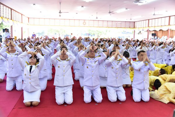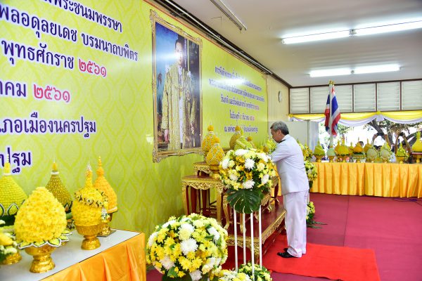โดยผู้ว่าราชการจังหวัดนครปฐม นำส่วนราชการ รัฐวิสาหกิจ องค์กรภาคเอกชน และภาคประชาชน ร่วมวางพานพุ่ม เบื้องหน้าพระบรมฉายาลักษณ์ พระบาทสมเด็จพระปรมินทรมหาภูมิพลอดุลยเดช บรมนาถบพิตร จากนั้นได้นำกล่าวถวายราชสดุดีน้อมรำลึกในพระมหากรุณาธิคุณ และถวายบังคม เพื่อแสดงความจงรักภักดี และรำลึกในพระมหากรุณาธิคุณ ตลอดรัชสมัยของพระบาทสมเด็จพระปรมินทรมหาภูมิพลอดุลยเดช บรมนาถบพิตร ทรงปกครองอาณาประชาราษฎร์ ด้วยทศพิธราชธรรม ทรงบำเพ็ญพระราชกรณียกิจอเนกประการ เพื่อวางรากฐานการพัฒนาประเทศให้มีความเจริญก้าวหน้าอย่างมั่นคง ทั้งทางด้านศิลปวัฒนธรรมและวรรณคดี ด้านการศึกษา ด้านชลประทาน การอนุรักษ์น้ำและดิน การพัฒนาชนบท และโครงการอันเนื่องมาจากพระราชดำริทั้งหมด 4,741 โครงการ ซึ่งพสกนิกรชาวไทยทุกหมู่เหล่า ต่างซาบซึ้งในพระมหากรุณาธิคุณอย่างหาที่สุดมิได้