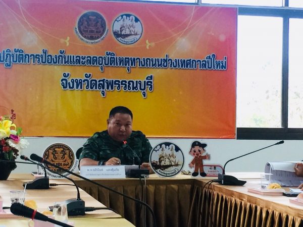 ที่ห้องประชุม สำนักงานป้องกันและบรรเทาสาธารณภัย จ.สุพรรณบุรี พันโทอภินันท์ แสงพันธ์คุ้ม กองกำลังรักษาความสงบเรียบร้อย มณฑลทหารบกที่ 17 เป็นประธานการประชุมศูนย์ปฏิบัติการป้องกันและลดอุบัติเหตุทางถนนช่วงเทศกาลปีใหม่ 2561 จังหวัดสุพรรณบุรี โดยมีส่วนราชการที่เกี่ยวข้องเข้าร่วมประชุม เพื่อระดมความเห็นการรณรงค์ในห้วง 6 วันที่ผ่านมา โดยเฉพาะการวิเคราะห์จุดที่เกิดเหตุ ด้านการบริหารจัดการ ต้องให้ฝ่ายปกครอง มีส่วนร่วมในการเข้าตรวจสอบที่เกิดเหตุเพื่อร่วมบูรณาการข้อมูลการเกิดอุบัติเหตุทางถนน พร้อมมีการประชาสัมพันธ์ ความรู้การยังคับใช้กฎหมายแก่ผู้นำขุมชนในพื้นที่ โดยสถานศึกษาต้องปลุกจิตสำนึกในเรื่องวินัยจราจรให้แก่นักเรียน นักศึกษา เพราะยังมีบางส่วนยังมีพฤติกรรมการขับขี่รถไม่ปลอดภัย ส่วน ด้านการบังคับใช้กฎหมาย ต้องมีความเข้มข้นและจริงจังมากขึ้น และต่อเนื่อง