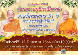 ขอเชิญศิษยานุศิษย์ร่วมถวายมุทิตาสักการะ อายุวัฒนมงคล 51 ปี พระครูปลัดสิทธิวัฒน์(หลวงพี่น้ำฝน) เจ้าอาวาสวัดไผ่ล้อม จ.นครปฐม