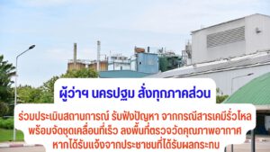 ผู้ว่าฯนครปฐม สั่งทุกภาคส่วน ร่วมประเมินสถานการณ์ รับฟังปัญหา จากกรณีสารเคมีรั่วไหล พร้อมจัดชุดเคลื่อนที่เร็ว ลงพื้นที่ตรวจวัดคุณภาพอากาศ หากได้รับแจ้งจากประชาชนที่ได้รับผลกระทบ